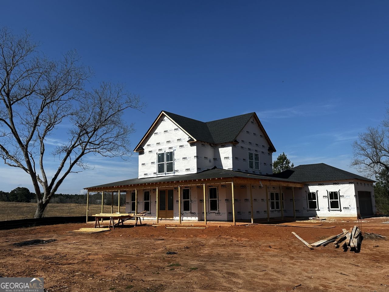 Quintessential southern Georgia summer nights await you. Gorgeous 4 gabled farmhouse sits proudly atop a rise in the woods. This home is situated on an 8 acre lot overlooking a serene pasture. The large southern wrap around porch is perfect for ferns and rocking chairs. Watch fireflies in the trees as the sun sets across the pasture. Step inside to the open concept living area that features a large kitchen, living room, and dining space that make entertaining a breeze. The large kitchen, dining space, living room, porch and backyard have the perfect flow for entertaining. All that's missing is a fire pit and some string lights! The master on the main has tons of natural light and a huge bath with separate tub and shower, two vanities, and two closets. The upper floor consists of two secondary bedrooms each with 2 closets and their own full bathrooms as well as a large flex room or 4th bedroom and two more storage closets. The covered back porch leads out to the large back yard. The oversized attached 2 car garage has space for a craft, atv storage, or workshop.