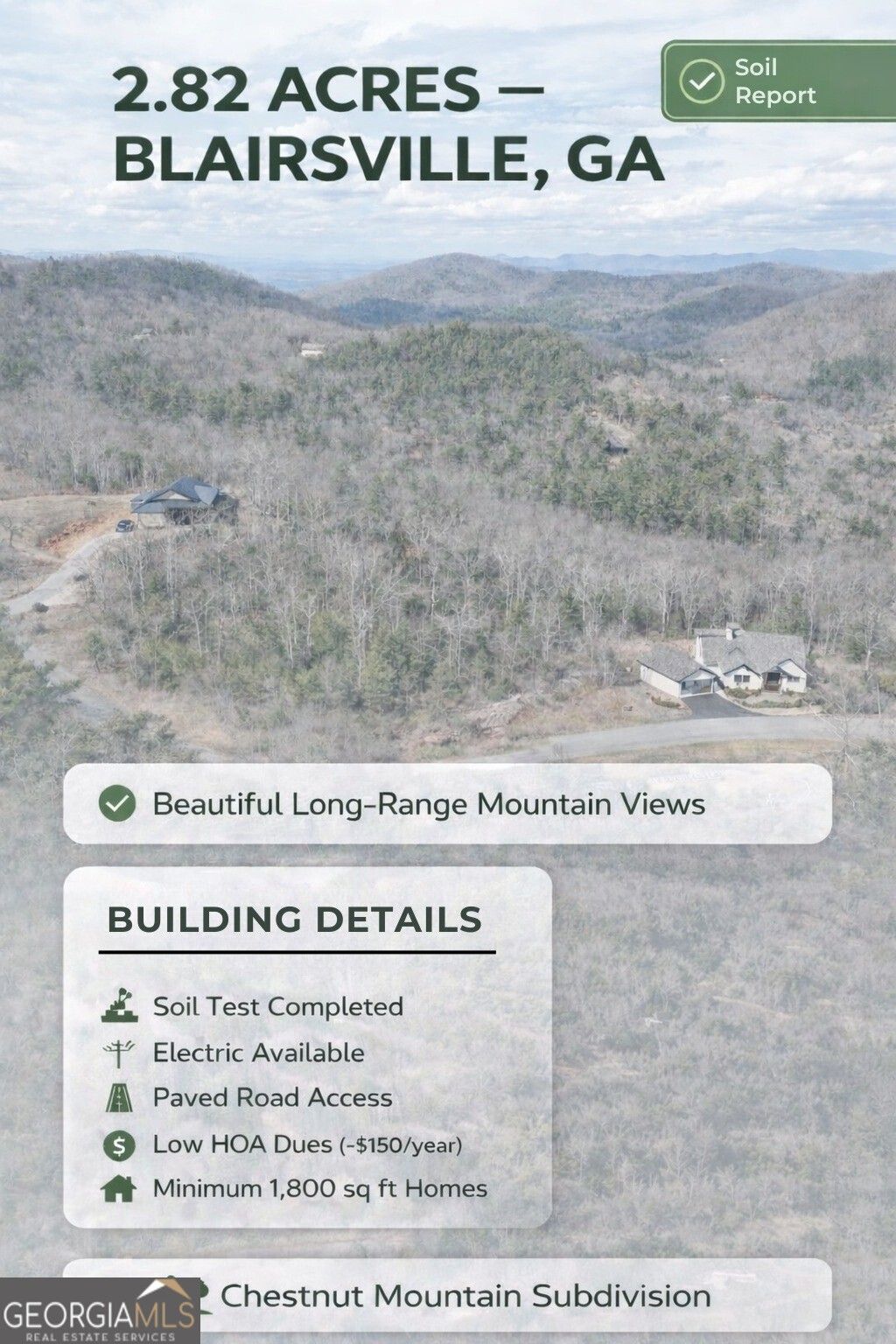 2.82 Acres - Beautiful Long-Range Mountain Views - Soil Test and Survey Completed Beautiful long-range mountain views from this 2.82 acre homesite in the Chestnut Mountain subdivision just minutes from downtown Blairsville. Build your mountain retreat on this 2.82 acre homesite located in the quiet Chestnut Mountain subdivision just minutes from downtown Blairsville. This elevated lot offers beautiful long-range mountain views and a natural slope that is ideal for a mountain home designed to capture the surrounding Blue Ridge scenery. Several attractive homes are already built in the neighborhood, giving buyers confidence in the area while still providing privacy and wooded surroundings. Both a recent survey and soil test have been completed, giving buyers added clarity and confidence when planning their future build. Property features include: 2.82 wooded acres Beautiful long-range mountain views Survey completed Soil test completed Elevated homesite with excellent view potential Electric available through Blue Ridge Mountain EMC Paved road access Well and septic typical for the area Located in the Chestnut Mountain subdivision Minimum 1,800 sq ft homes per subdivision covenants Low HOA dues (~$150/year). Enjoy the peaceful setting of the North Georgia mountains while still being just minutes from downtown Blairsville, shopping, dining, and outdoor recreation including Lake Nottely, Vogel State Park, Brasstown Bald, and the Chattahoochee National Forest. Whether you're planning a full-time residence, mountain getaway, or investment property, this lot offers an excellent opportunity in one of Union County's most desirable mountain areas.