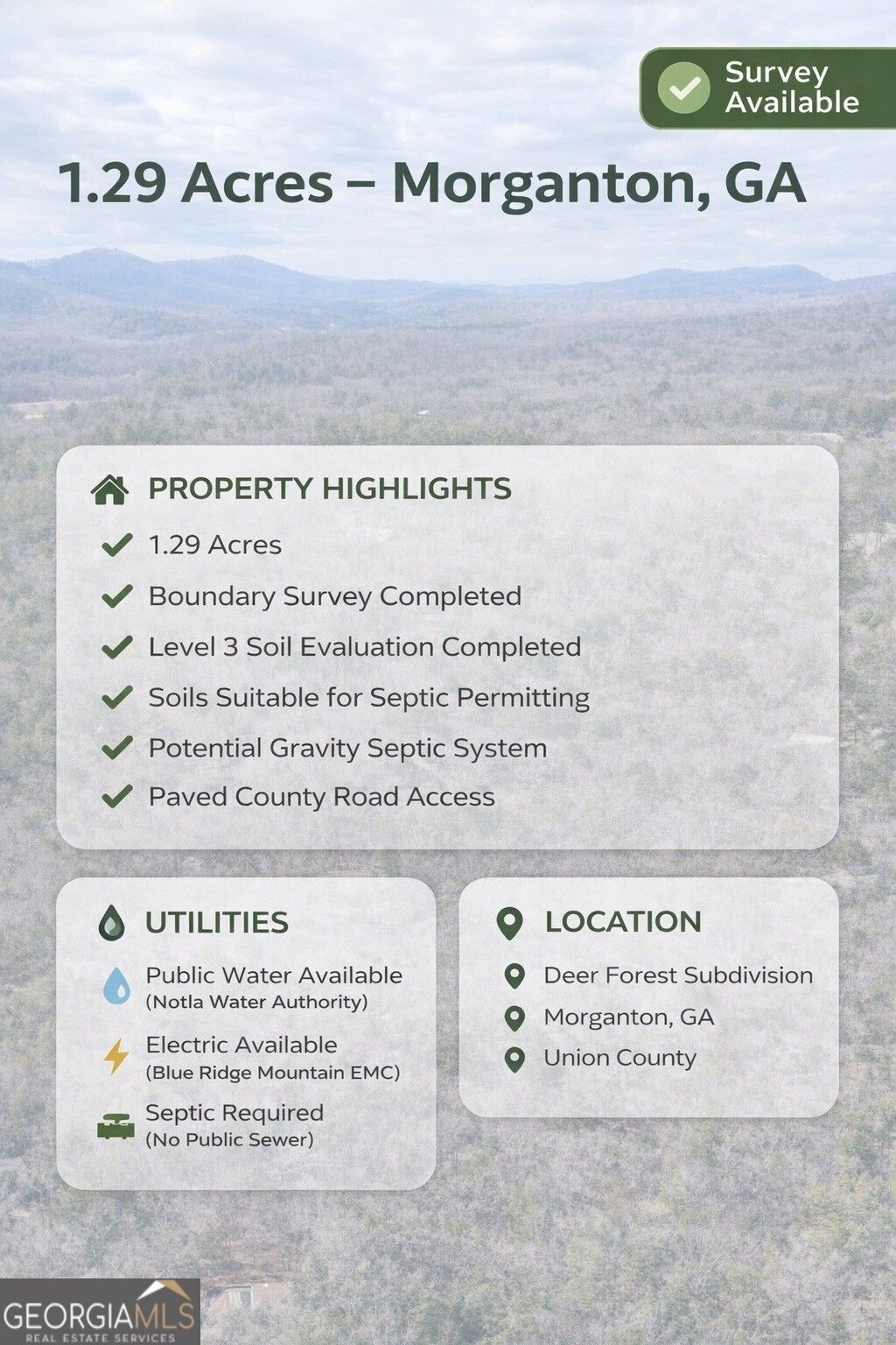 Build-Ready Lot in the North Georgia Mountains - Survey & Soil Evaluation Completed. This 1.29-acre lot in the Deer Forest subdivision offers an excellent opportunity to build your mountain cabin, full-time residence, or vacation retreat in beautiful Morganton, Georgia. The property features paved county road frontage along with a completed boundary survey and Level 3 soil evaluation, making it easier for the next owner to move forward with planning and permitting. According to Union County Environmental Health, the mapped soils are suitable for septic permitting and the property should not present difficulty designing a system, with gravity flow potential depending on the final home site plan. Utilities are available nearby including public water from Notla Water Authority and electric service from Blue Ridge Mountain EMC. Located in the scenic North Georgia mountains, the property offers a peaceful setting while still being within a short drive of Blue Ridge, Lake Blue Ridge, and endless outdoor recreation. Property Highlights: 1.29 Acres Boundary Survey Completed Level 3 Soil Evaluation Completed Soils Suitable for Septic Permitting Potential Gravity Septic System Paved County Road Access Public Water Available (Notla Water Authority) Electric Available (Blue Ridge Mountain EMC) Deer Forest Subdivision Union County, GA