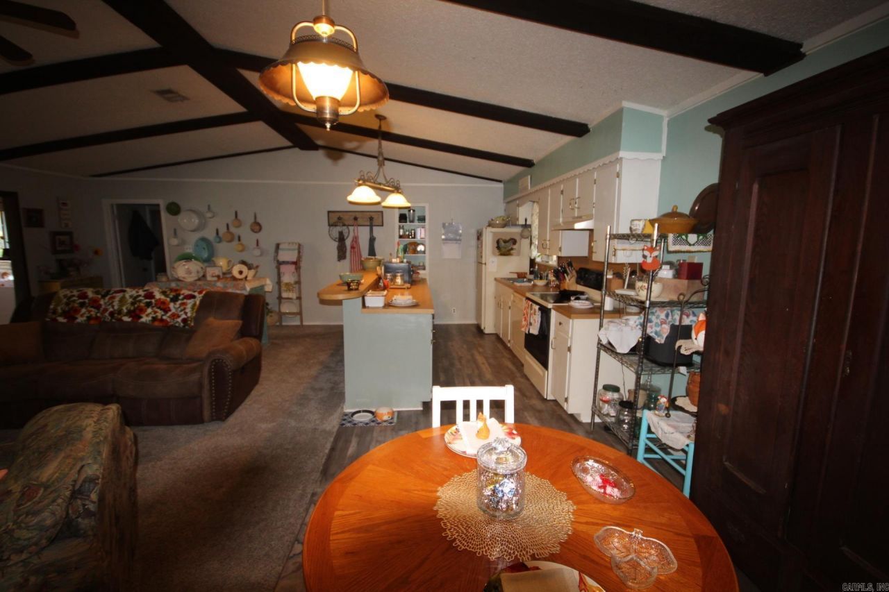 2 Bedroom, 1.5 Baths with approx. 1980 Sq. Ft. of living space. Two living areas, main living area features fireplace, beamed ceiling. Central AC & Heat. Roof only 2 years old. Large rear deck. Located close to great fishing, duck hunting and Millwood Golf Club. Range, Microwave and Refrigerator convey with sell of property.