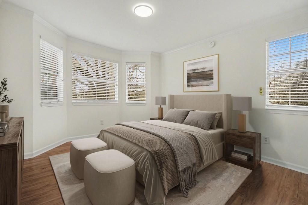 Perfectly positioned in the heart of Midtown with Walkability to Georgia Tech, Atlantic Station, and MARTA, this light-filled 3rd Floor Condo offers the ideal blend of city convenience and comfortable everyday living. Whether you're a Georgia Tech Parent purchasing for a student, or a Young Professional seeking intown access, this flexible floor plan fits a variety of lifestyles. Inside, Hardwood Floors run throughout the main living areas, creating a warm and welcoming feel from the moment you enter. The Open and Large Living Room provides plenty of space for both a comfortable seating area and a dedicated Study or Work-From-Home Space, making it perfect for students or remote professionals. The Kitchen overlooks the Living Area, creating an easy flow for entertaining or everyday living. The thoughtful Roommate-Friendly Floor Plan features Two Spacious Bedrooms positioned for privacy, each with access to its own Full Bathroom. The Primary Suite includes a Private Ensuite Bathroom, while large Bay Windows in the Bedrooms fill the home with beautiful Natural Light and offer charming neighborhood views. Step outside to your own Private Balcony, a perfect spot for morning coffee or unwinding after a long day. Additional conveniences include In-Unit Laundry and an Assigned Parking Space, with additional street parking. Residents enjoy a Pet-Friendly Community with access to a Swimming Pool, offering the perfect balance of active living and city convenience. Located just minutes from Georgia Tech, Midtown, Atlantic Station, Restaurants, Parks, and Major Atlanta Arteries, this home delivers exceptional accessibility while still offering a quiet neighborhood feel.
