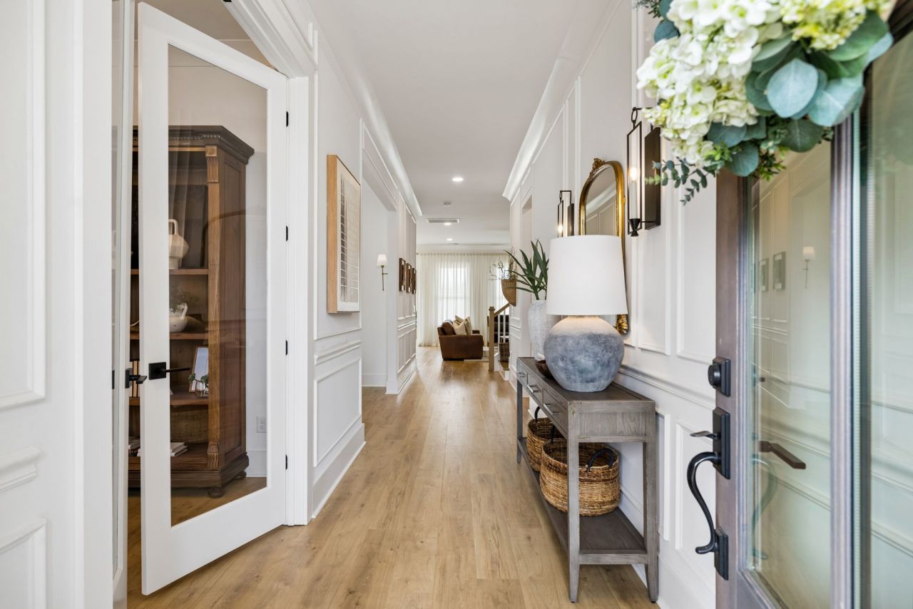 Built in 2021, this gorgeous white farmhouse offers peaceful views of a stocked lake and backs to protected common area, creating a private retreat you'll enjoy every day. With 5 bedrooms and exceptional designer finishes throughout, this home blends modern comfort with timeless style.The main level showcases beautiful 8 wide-plank white oak floors, deep baseboards, picture-frame molding, and classic wainscoting that add warmth and character to every space.. A dedicated home office with batten accent wall provides the perfect work-from-home space.At the heart of the home, the designer kitchen is both beautiful and functional. Glass-front cabinetry, a custom hood, gas cooktop, and an oversized island make it ideal for entertaining or everyday gatherings. The kitchen flows seamlessly into the breakfast nook and spacious family room anchored by a cozy fireplace. A well-appointed butler's pantry and walk-in pantry offer abundant storage and convenience.Even the powder room feels like a design moment, featuring a custom vanity, elevated fixtures, and floor-to-ceiling luxury tile.The primary suite is a true retreat-complete with a shiplap accent wall, wood beam ceiling detail, wall-to-wall drapery, bamboo shades, and a statement chandelier that sets the tone for relaxed luxury. The laundry room conveniently connects to both the primary suite and hallway.Upstairs you'll find four additional bedrooms (including a Jack-and-Jill), a large bonus room, and a second laundry room.Outside, the setting truly shines. The covered patio overlooks the stocked lake and private fishing pier, creating a backyard experience that feels like a private retreat. Additional trees along the side of the home provide extra privacy, while the irrigated lawn and three-car garage with extended parking add thoughtful practicality.Homes with this combination of lakefront views, designer finishes, and modern farmhouse charm are rare.