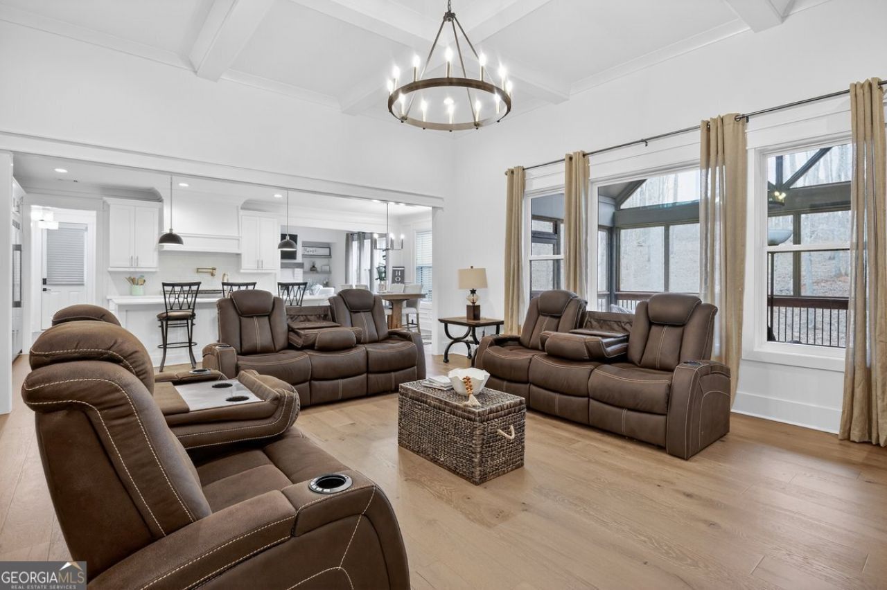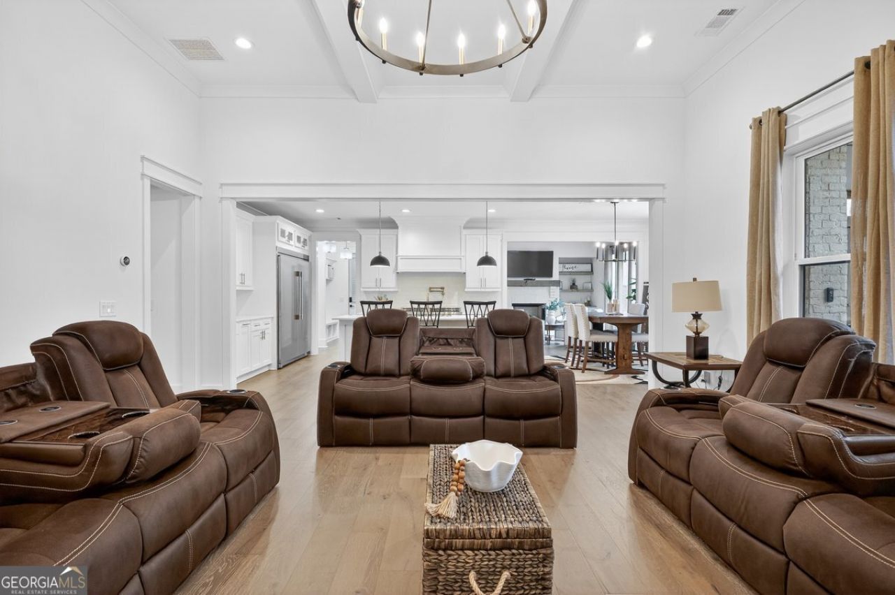 Luxury living awaits in the gated golf community of River Forest--this stunning 5-bedroom, 4.5 bath home on 1.32 acres features a finished daylight basement and is only minutes to I-75, 45 minutes from Atlanta and 30 minutes from Macon. Inside you'll find soaring ceilings, extensive trim work, and custom built-ins throughout. The spacious kitchen opens to the great room, while the oversized dining room and vaulted keeping room with fireplace create the perfect spaces for entertaining. Enjoy year-round outdoor living on the screened porch with fireplace. The main-level owner's suite features dual vanities, a spa-like bath, and a large walk-in closet. Upstairs offers a secondary master suite, two additional bedrooms, and a bonus room. The finished daylight basement is an entertainer's dream with a theater room with IMAX-quality sound, game room, kitchenette, office, workout room, bedroom, full bath, and a steel-reinforced safe room. A screened patio extends the living space outdoors. Additional highlights include a 3-car garage with epoxy flooring and access to golf, swim, tennis, and pickleball amenities. Luxury, space, and resort-style living all in one stunning home.
