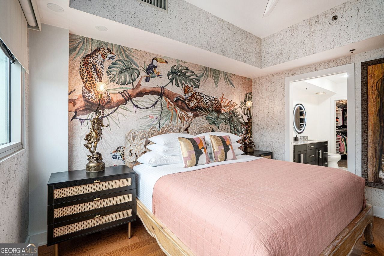 Live Boldly in the Heart of the Westside! Welcome to White Provision, one of Atlanta's most Iconic Buildings in the vibrant Westside Provisions District. Step inside this Show-Stopping Three Bedroom, Two and a Half Bath Condo where modern design meets curated style and breathtaking City Views. From the moment you enter, the Gallery-Style Hallway sets the tone with designer wallpaper and custom lighting leading you into the open, light-filled Living Space. The Expansive Family Room features floor-to-ceiling windows, a custom accent wall, and access to your Private Balcony perfect for catching sunset skies over the city. The Chef's Kitchen impresses with Shaker-Style Cabinets, sleek Stone Countertops, Subway Tile Backsplash, Chic Pendant Lighting, and Top-of-the-Line Stainless Steel Appliances. The Oversized Island offers plenty of prep space and seating, ideal for entertaining or morning coffee. Retreat to the Primary Suite, a serene escape featuring a statement mural wall, Spa-Like Ensuite Bathroom with Double Vanity, Soaking Tub, Glass-Enclosed Shower, and a Custom Walk-In Closet. Two additional Bedrooms each showcase their own design personality with bold wallpaper, and easy access to the stylish Full Bathroom. A designer Half Bath with tropical wallpaper adds a fun touch of personality and charm. Enjoy a cocktail on your Private Balcony as the city lights come alive or unwind in the comfort of your airy living space. This home also features Hardwood Floors Throughout, In-Unit Laundry, a Private Storage Unit, and Two Secured, Covered Parking Spaces conveniently located near the elevator. Residents of White Provision enjoy access to premier amenities including a Concierge, Lap Pool, Fitness Center, Grilling Area, and even a Guest Suite. Step outside and experience the very best of Atlanta's Westside, with world-class dining, shopping, and entertainment at your doorstep Marcel, The Optimist, Star Provisions, O-Ku, Puttshack, Chattahoochee Food Works and The Interlock, along with high-end boutiques and shops. With effortless access to I-75/85, Midtown, Atlantic Station, and Georgia Tech, this condo offers the ultimate combination of style, sophistication, and convenience. Unit 808 at White Provision isn't just a home it's a Lifestyle Statement.