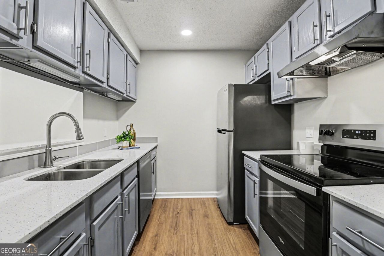 Welcome home to this beautifully updated 2 Bedroom, 2 Bathroom Condo in the sought-after Barrington Hills community of Sandy Springs, perfectly positioned near Morgan Falls Reservoir and everything that makes this area so desirable. Step inside to find warm Hardwood Floors and a spacious, light-filled Fireside Family Room that opens directly to your Private Covered Deck, the perfect spot for morning coffee or unwinding after a long day while enjoying peaceful wooded views. The Updated Kitchen features Neutral Cabinetry, Stone Countertops, Stainless Steel Appliances, and a dedicated Dining Area, creating an easy flow for both everyday living and entertaining. The oversized Primary Suite offers an Updated Bathroom featuring a bright white vanity, Shower/Tub Combo, and a generous Walk-In Closet. A well-sized Secondary Bedroom and full Hall Bathroom provide excellent flexibility for guests, roommates, or a comfortable Home Office. A dedicated Laundry Room inside the unit adds everyday convenience. Nestled in a quiet, wooded setting just moments from Morgan Falls Park and the Chattahoochee River, this home offers unbeatable access to outdoor recreation while remaining incredibly convenient to Sandy Springs, Dunwoody, and Roswell shopping and dining. MARTA access nearby and quick connections to major commuter routes make getting around effortless. Barrington Hills residents also enjoy access to a Community Pool, adding even more appeal to this move-in ready home. A fantastic opportunity to enjoy the perfect blend of Comfort, Convenience, and Location in one of Sandy Springs' most desirable communities.