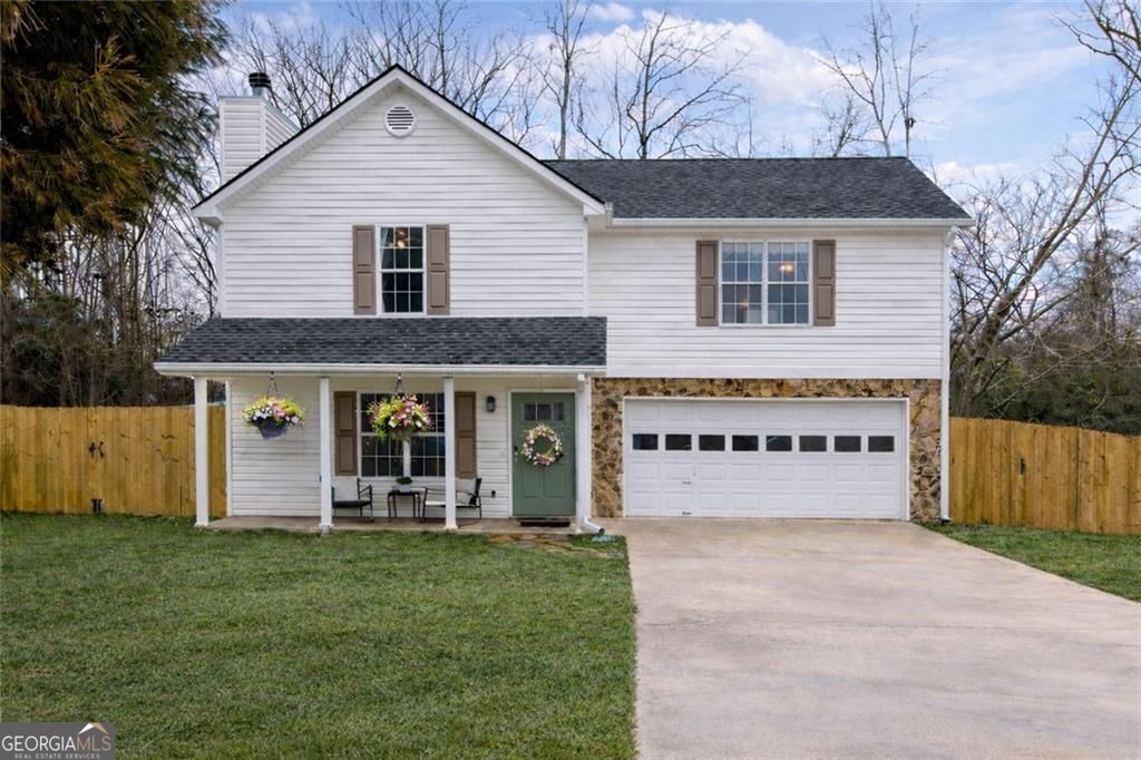 SELLER providing a 1-YEAR HOME WARRANTY MAX PLAN on this MUST SEE, UPDATED - 3 bed, 2.5 bath, traditional home on almost a half acre lot in Downtown Dawsonville! This cozy home features a charming front porch patio as well as a desirable, flat, grassed and wooded, backyard with a small creek running along the back. The kitchen features ample white counter and cabinet space, a pantry, and a breakfast/dining area that leads to the open family room! This spacious Family Room features hardwoods, shiplap, and a wood burning fireplace. Upstairs there is a large master suite with updated double vanities and his/hers separate walk in closets. The two secondary bedrooms are spacious and share an updated hall bath with tub/shower. There is NO CARPET in this home! Additional features include: newer roof, newer floors throughout, updated lighting throughout, a covered cabana/gazebo that stays over the back patio, a newly built large shed, an optional dog kennel/run in the back yard, and some already built garden beds for your green thumb! This beauty is nestled in the welcoming community of Dawsonville, GA and is WALKING DISTANCE to the cute downtown area. The community provides a blend of established charm and modern convenience. Come see this exceptional opportunity to establish roots in a comfortable, move-in ready home and neighborhood!