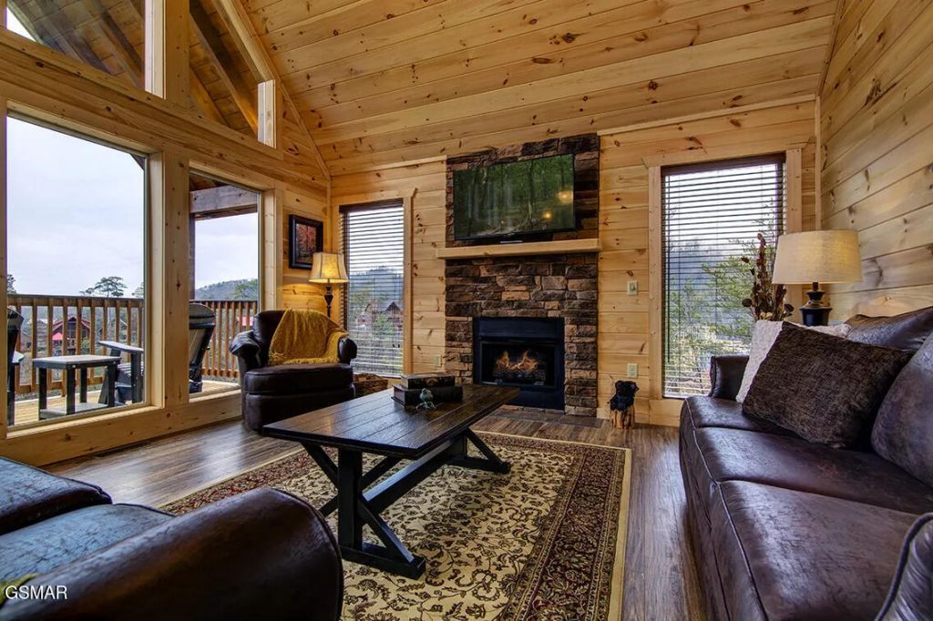 Smoky Mountain living is better than ever at this luxurious cabin retreat mere minutes from all the action along the Pigeon Forge Parkway, while also being convenient to attractions in downtown Gatlinburg! This extraordinary 2 Bed, 2 Bath home will capture your heart the moment you step out of your car. A paved circular drive marks an easy arrival, and the wrap around porch places immediate emphasis on elegant indoor/outdoor living with views that stretch out over breathtaking mountain vistas. As you enter the modern open concept layout, you'll find the views are just as rich and endless, with a wall of windows that creates an abundance of space and light. Cathedral ceilings are artfully balanced with exposed beams and modern lighting, adding to a grandeur of sophistication. The living room with fireplace accesses the deck and connects to the kitchen to provide the perfect environment for whipping up tasty treats. Stainless steel appliances serve up culinary efficiency, along with a granite-clad island with raised bar that offers a destination for intimate meals or helping hands. Head outside and watch the fog roll over the mountains, tune into the sounds of nature, and even gather around the outdoor fireplace. Within this 1900sqft layout there are two bedrooms and two bathrooms as well as a lower-level game room with wet bar and theater room with tiered seating. This level also accesses the lower deck and hot tub for a sense of decadence embraced by a rugged landscape. With internet available, every modern amenity is at hand, but it also provides a quiet sense of solitude that intimately connects you to the heartbeat of nature. This property truly provides a great venue for short-term rentals, bestowing both seclusion and a prime location near all the best hot spots including restaurants, interactive museums, dinner shows, shopping, outdoor adventures and more! It is a fantastic opportunity to own a premium mountain getaway with exceptional views for excellent rental performance. Buyer to verify all information.