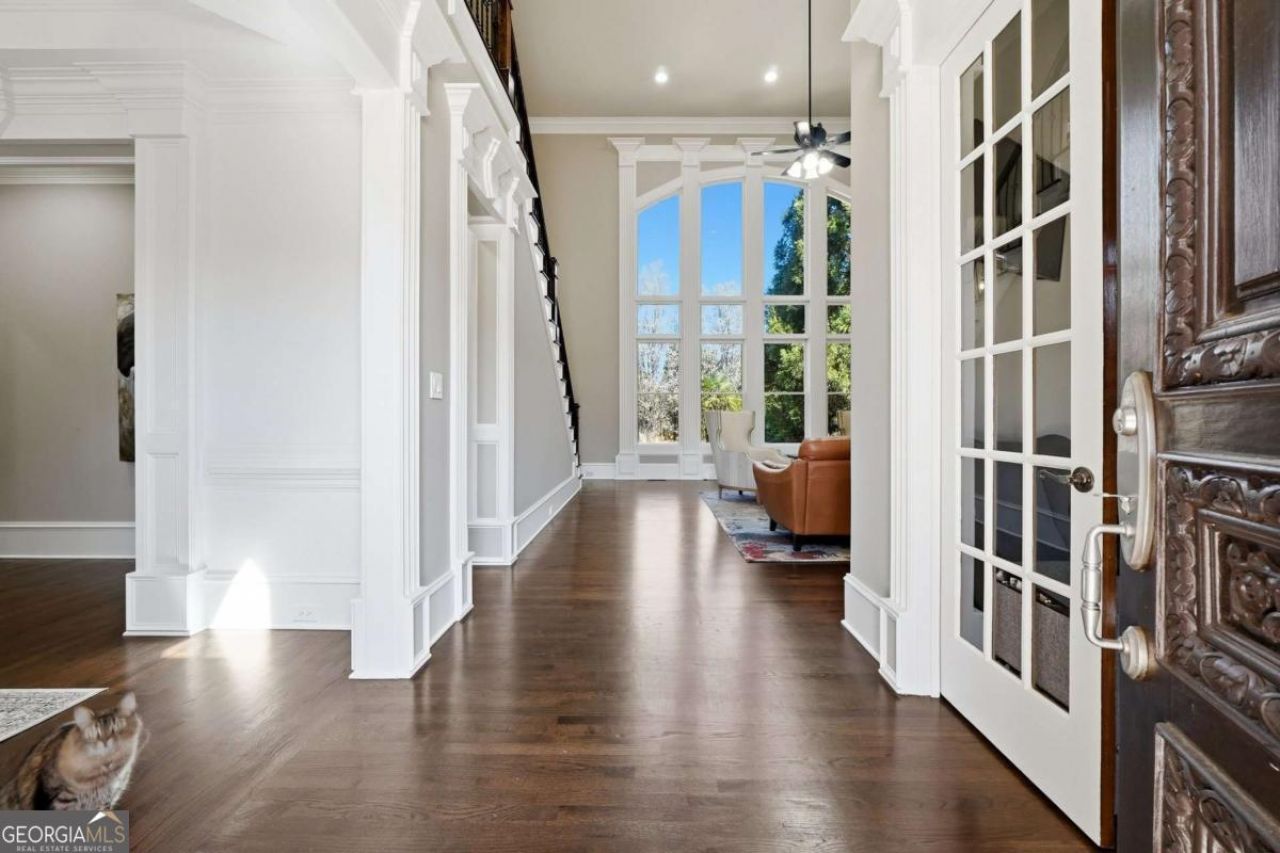 Nestled in one of East Cobb's most sought-after neighborhoods and located within the prestigious Walton High School district, this exceptional four-sided brick estate offers a rare combination of timeless elegance, generous scale, and thoughtfully curated upgrades across three beautifully finished levels. Designed to impress while offering everyday comfort, the main level is filled with natural light and enhanced by rich hardwood flooring, tinted windows for added privacy, and a dramatic two-story family room featuring soaring ceilings and an oversized picture window overlooking the private backyard retreat. The seamless flow between formal and casual living spaces creates an ideal setting for both refined entertaining and daily living.The chef's kitchen is beautifully appointed with quartz countertops, premium JennAir double ovens, extensive cabinetry, and a spacious butler's pantry, opening effortlessly to the heart of the home. A private office, elegant formal dining room, guest suite with full bath, and oversized powder room complete the main floor, while updated lighting and designer ceiling fan fixtures add fresh sophistication throughout. Outdoor living is truly exceptional, anchored by an expansive Trex deck overlooking a private fenced backyard designed as a resort-style retreat. The heated pool with fountain, lush landscaping, app-controlled irrigation and lighting, and dedicated volleyball area create a rare outdoor setting ideal for both quiet enjoyment and large-scale entertaining. Upstairs, the primary suite serves as a luxurious private sanctuary with fireplace, sitting area, oversized walk-in closet, and spa-inspired bath featuring jacuzzi tub, dual vanities, makeup station, and extensive cabinetry. A thoughtfully redesigned upper-level layout creates a true second primary suite with its own sitting area and beautifully renovated bath finished in updated stone, while a third upstairs bedroom also enjoys its own private en-suite bath for maximum privacy and comfort.The terrace level offers outstanding flexibility and comfort, featuring a full secondary kitchen with pantry and vented hood, dining area, spacious entertainment lounge, full bath, dedicated gym space, and a custom theater/media room complete with built-in wall and ceiling speaker wiring and speakers. Fresh paint throughout the terrace level enhances the bright updated feel, while built-in sound, central vacuum, and solar security cameras add convenience and functionality. Additional highlights include upgraded bathrooms with all toilets replaced throughout the home, newly painted basement and selected main and upper-level rooms, sealed front stone exterior, and a three-car garage with new openers, extra storage, and a 240V electric vehicle charging outlet. Full smart-home integration controls thermostats, garage doors, lighting, cameras, and pool systems with ease. Ideally positioned with convenient access to Interstate 75, this extraordinary residence presents a rare opportunity to own a thoughtfully upgraded luxury property in the heart of Marietta.