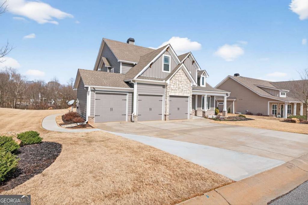 Perfectly positioned along the 9th fairway in the sought-after Chimney Oaks Golf Club community, this exceptional residence offers a rare opportunity to experience refined golf course living in the foothills of Northeast Georgia. Designed to capture sweeping views and peaceful surroundings, the home combines timeless craftsmanship with modern comfort, creating an elegant retreat where every day feels like a getaway. From the moment you arrive, the inviting covered front porch and classic curb appeal set the tone for the lifestyle within. Step through the front door into a dramatic two-story foyer where natural light pours into the open living spaces, highlighting beautiful hardwood floors and soaring architectural details. The impressive two-story great room creates a striking centerpiece, anchored by a warm fireplace and framed by expansive views of the golf course beyond. The gourmet kitchen has been thoughtfully designed for both entertaining and everyday living. Featuring granite countertops, crisp white cabinetry, stainless steel appliances, a large center island, and an oversized walk-in pantry, the space flows seamlessly into the dining and living areas-perfect for gathering with friends and family. A serene primary suite on the main level offers a private sanctuary, complete with elegant tray ceilings, a spacious walk-in closet with custom storage, and a beautifully appointed spa-style bath featuring a soaking tub, and oversized tiled shower. Upstairs, a thoughtfully designed landing overlooks the great room and offers another beautiful perspective of the golf course. Three additional bedrooms provide comfort and privacy for family or guests, including a bedroom with its own ensuite bath and additional flexible space ideal for visitors or a private retreat. Outdoor living is equally impressive. The screened back patio with fireplace invites year-round relaxation, while the custom brick courtyard patio creates an additional space to unwind or entertain under the open sky. Surrounded by beautifully landscaped grounds, the setting offers both privacy and picturesque views of the fairway. Extensive upgrades enhance the home's quality and convenience, including epoxy-finished porch and garage floors, spray foam insulation, irrigation system, expanded driveway parking, and a three-car garage with dedicated golf cart bay-perfect for quick access to the community amenities. Life at Chimney Oaks is defined by resort-style living. Residents enjoy access to a championship 18-hole golf course, clubhouse with restaurant and bar, fitness center, junior Olympic pool, tennis and pickleball courts, and The Forge golf training facility featuring TrackMan technology. Ideally located near Highway 441 and I-85, the home offers effortless access to shopping, dining, Tanger Outlets, and the vibrant destinations of Athens, Gainesville, Helen and the North Georgia mountains. Elegant, thoughtfully upgraded, and beautifully situated on one of the community's most desirable golf course homesites, this residence offers an exceptional opportunity to experience the Chimney Oaks lifestyle at its finest.