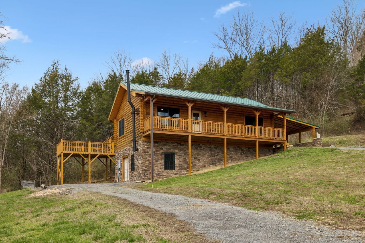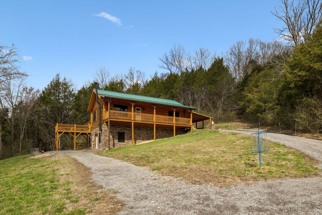 Beautiful Honest Abe log cabin built in 2023 on 62.63 scenic acres! This secluded retreat features Eastern Pine and Douglas Fir logs, red oak hardwood floors, and a cozy Lopi wood-burning stove. Approx. 2,080 sq ft including 2 bedrooms and a full bath on the main level and full finished basement with bathroom and utility room. Kitchen appliances and garbage disposal remain, as well as ceiling fans and all window treatments. Professional wood stain sprayer also remains. Old barn at property entrance conveys. Power, fiber internet, and utility district water already in place. New water line along the road, and water pressure booster pump stays. Floored attic provides excellent storage and includes spray foam insulation. Termite contract in place. Owner cleared a walking/running trail from end of the property to the other lengthwise. Property has at least one spring and there is plenty of mature timber. Owner engineered the driveway to handle the water flow when it rains. Convenient to outdoor recreation with a Cumberland River boat ramp just a short drive away, yet less than 1.5 hours to BNA. C'mon, y'all!