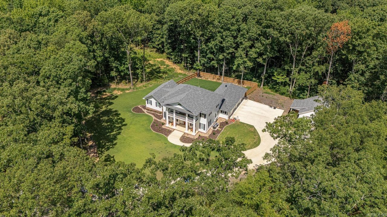 Nestled on 6.6 wooded acres in the Valley View School District, this 2023 custom-built home perfectly blends timeless Southern charm with modern luxury. Spanning 3,270 sq. ft., it features 4 bedrooms, 3.5 baths, and elegant details throughout, from stately white pillars and copper gas lanterns to marble fireplace surrounds and a cast-iron soaking tub. The main level offers a formal dining room, dedicated office, kitchen with high-end appliances, and a custom dog-washing station. Upstairs includes a second living area and three spacious bedrooms. The three-stall garage includes a 10???x10??? concrete safe room, while the detached 550 sq. ft. heated and cooled garage with patio adds versatility. Enjoy peaceful mornings on the covered porch overlooking a private, fenced backyard, and watch for deer and turkey near the creek beyond. This one-of-a-kind property offers serenity, sophistication, and convenience just minutes from the heart of Jonesboro.