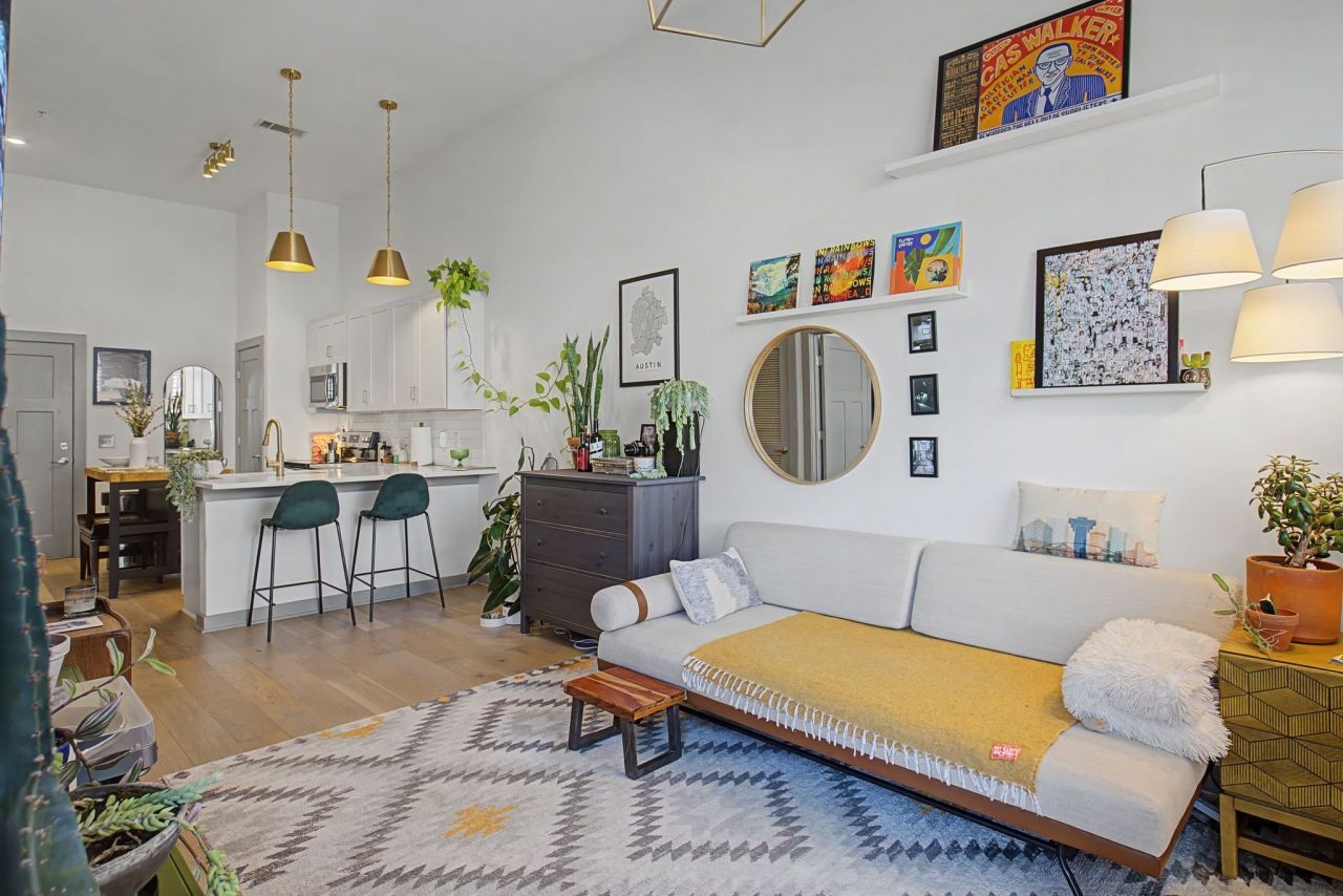 You'll love the upgrades in this trendy, upscale unit with 15 foot ceilings. From the closet, with custom built-ins, and plantation shutters to the new light fixtures and light oak flooring, this home is move-in ready! Because it's on the first floor, you'll have a front door and patio to enjoy. And the pool, grilling area and fitness center are an added bonus. Refrigerator, washer and dryer, and portable kitchen island stay.