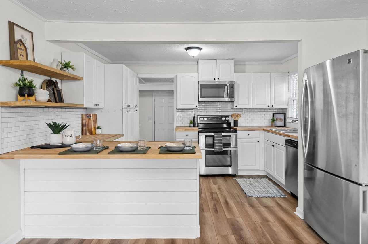 Completely REMODELED and move in ready! From the moment you step onto the covered front porch with a cedar ceiling, you will feel right at home. Inside, the OPEN CONCEPT layout creates an easy flow between the living, dining, and kitchen areas. A beautiful wood beam adds character to the main living space and makes a great focal point. The kitchen has been thoughtfully updated with a shiplap island, floating shelves, white subway tile backsplash, stainless steel appliances, and a double oven that is perfect for hosting or holiday meals. A large PANTRY cabinet offers plenty of storage, and the utility room comes complete with washer and dryer! New carpet has been installed in all bedrooms. The primary bedroom in on the main level and the on suite bathroom features double vanities and generous closet space. The 2 downstairs bedrooms have WALK IN CLOSETS giving you the STORAGE you have been looking for! Step outside to enjoy the level yard with mature trees and a SPACIOUS PATIO area that is ideal for gatherings, grilling, or relaxing in the evenings. The backyard is fenced. Covered parking adds extra convenience and protection from the elements! If you are searching for a fully updated home with functional space, great storage, and a yard ready to enjoy, and close to DOWNTOWN CLARKSVILLE this one checks the boxes. The upstairs room has its on exterior access with a private staircase, and full bath, AND bonus room, making it ideal for a rented separate living space! FUTURE POTENTIAL COMMERCIAL USE. Multiple homes on Golf Club just a few houses down have been rezoned commercial. Want to open up your own business in the future?? The potential is here. Lot is also extra deep allowing for additional parking or buildings in the back. Come take a look!