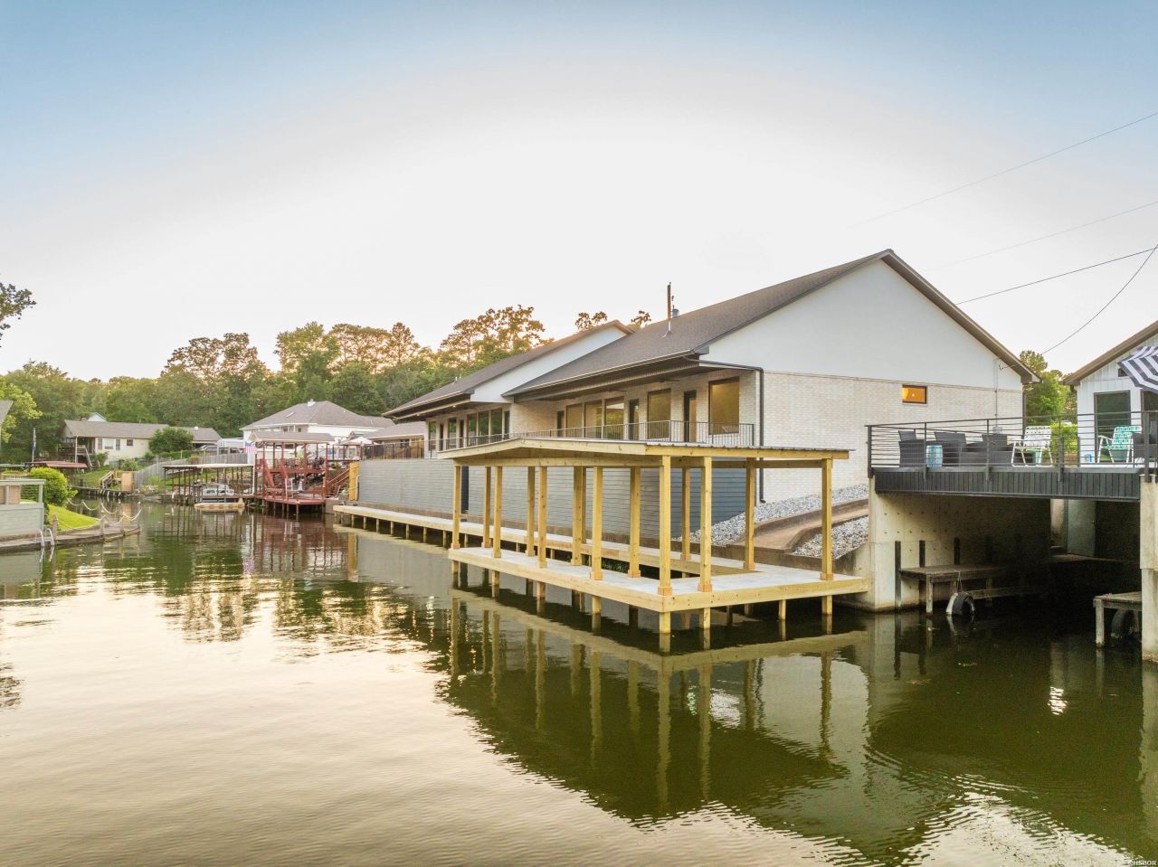 Welcome to your dream lakefront home on Lake Hamilton! Located in the 7 South area of Central Avenue, this 3 bedroom, 2 bathroom home offers an open concept floor plan with 11 foot ceilings. Step outside from the main living area or two of the lakefront bedrooms onto the large deck composed of composite wood and custom metal railing. There is gated access to the built in stairs that allow access to the brand new boardwalk and built in storage area under the deck. Capture stunning views of Lake Hamilton and the Central Avenue bridge right from your back deck, as well as fishing, swimming, and boating, then park your boat in your own covered boat dock! Inside, you will find modern finishes throughout, which include quartz countertops and backsplash, beautiful CAFE appliances with a built in ice maker, custom cabinets with black and champagne bronze finishes, along with a custom island and built in dining table. Ample natural light from the large windows throughout the home with views of the water from all angles. Roller window treatments already installed for ultimate privacy when needed. The primary bath has a spa-like feel that includes a free standing tub with rock surrounding and a full glass and tile shower. Other interior features include upgraded LED lighted mirrors in all bathrooms, a separate laundry room, and LVP flooring throughout. This property also offers an oversized 2 car garage as well as extra concrete for additional parking. All efforts were made to provide this home with a low maintenance exterior so you can spend more time enjoying the lake. Come see this stunning home with ALL the features you want in a lakefront property!