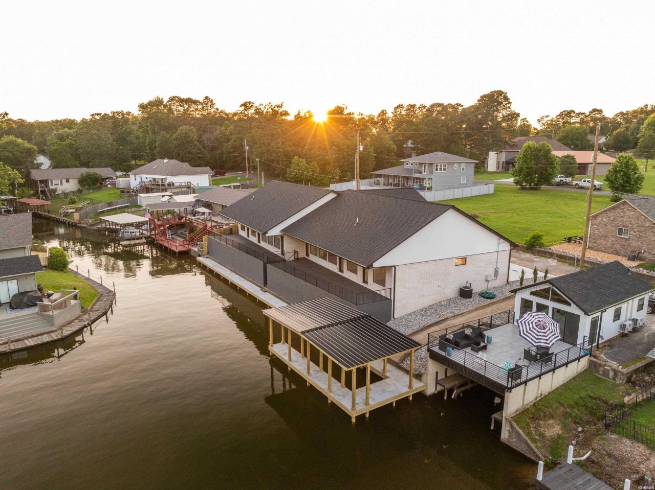 Welcome to your dream lakefront home on Lake Hamilton! Located in the 7 South area of Central Avenue, this 3 bedroom, 2 bathroom home offers an open concept floor plan with 11 foot ceilings. Step outside from the main living area or two of the lakefront bedrooms onto the large deck composed of composite wood and custom metal railing. There is gated access to the built in stairs that allow access to the brand new boardwalk and built in storage area under the deck. Capture stunning views of Lake Hamilton and the Central Avenue bridge right from your back deck, as well as fishing, swimming, and boating, then park your boat in your own covered boat dock! Inside, you will find modern finishes throughout, which include quartz countertops and backsplash, beautiful CAFE appliances with a built in ice maker, custom cabinets with black and champagne bronze finishes, along with a custom island and built in dining table. Ample natural light from the large windows throughout the home with views of the water from all angles. Roller window treatments already installed for ultimate privacy when needed. The primary bath has a spa-like feel that includes a free standing tub with rock surrounding and a full glass and tile shower. Other interior features include upgraded LED lighted mirrors in all bathrooms, a separate laundry room, and LVP flooring throughout. This property also offers an oversized 2 car garage as well as extra concrete for additional parking. All efforts were made to provide this home with a low maintenance exterior so you can spend more time enjoying the lake. Come see this stunning home with ALL the features you want in a lakefront property!