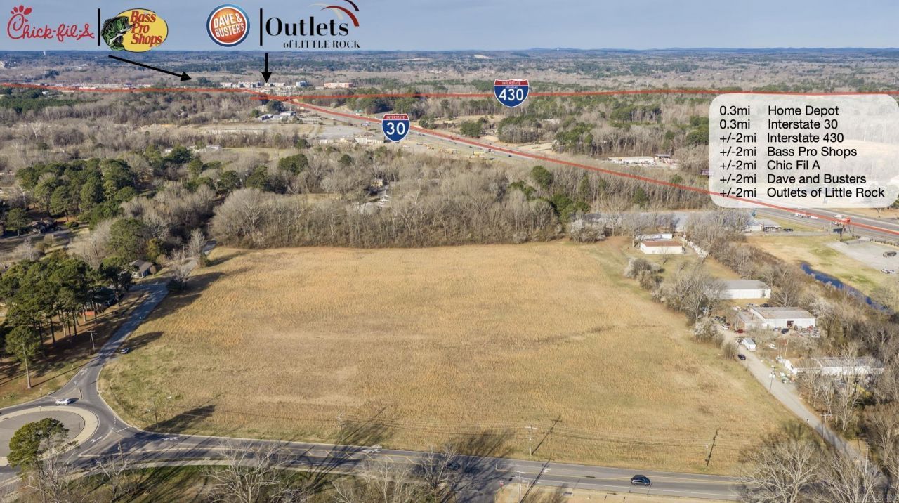 Prime Commercial Land Opportunity! 17.05-acre level corner commercial site in Little Rock with roundabout access and C-3 zoning allowing for a wide range of commercial uses. The property offers excellent visibility and accessibility and is located just 0.3 miles from I-30 with approximately 110,000 vehicles per day. Mabelvale Pike frontage with 9700 vehicles per day. 12 miles from Clinton National Airport. Positioned in a strong retail corridor near Bass Pro Shops, Outlets of Little Rock, Dave & Busters, Home Depot and numerous restaurants. Convenient access to both Benton and Bryant make this site well suited for retail, hospitality, service, or mixed commercial development.