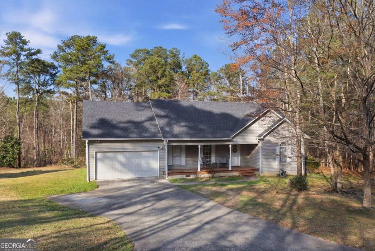 This charming single-story home offers the perfect blend of comfort, space, and privacy. Surrounded by mature trees, the property provides a quiet retreat while still offering the convenience of easy living. Inside, the home features a bright and spacious living room with soaring vaulted ceilings, creating an open and airy feel that is perfect for relaxing or entertaining. The large sectional seating area highlights the generous space and natural light flowing through the home. The kitchen offers abundant cabinet storage, generous counter space making meal prep simple and efficient. The layout allows plenty of room for a dining area while maintaining a clean, functional design. Step outside to enjoy the covered front porch or spacious back deck both are a perfect spot for morning coffee or evening relaxation while overlooking the peaceful fenced in yard and surrounding woods that creates a nice buffer of the neighboring homes. With a split bedroom floor plan this home offers spacious bedrooms and updated bathrooms.
