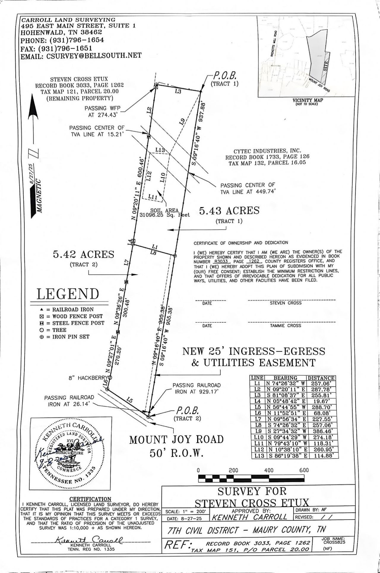 Two tracts available! NO DEED RESTRICTIONS! This 5.42-acre tract offers 288 ft of road frontage, providing convenient access for utilities and an ideal location for your next project. Bring your builder and take advantage of the open space and flexibility this property provides. Conveniently located about 20 minutes from Maury Regional Hospital. Includes a 25-ft ingress/egress and utilities easement that provides access to Tract 1 located behind this property. Peaceful rural setting with easy access to nearby towns, shopping, and I-65.