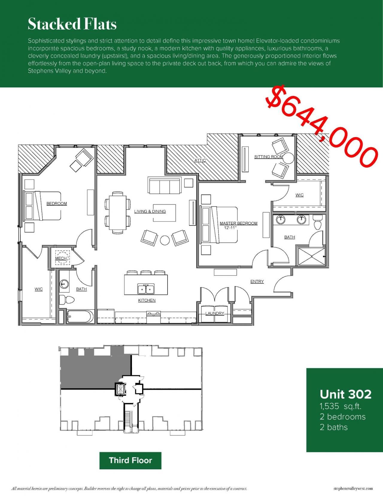 One-level living in desirable Stephens Valley West by Rochford Construction Company! Sophisticated style, smart floor plans, and comfortable living spaces are the foundations of condominium living in this community. Enjoy the beautiful views from your two-bedroom home with details including nine-foot ceilings, custom trim, and plenty of storage in sleek, quality cabinetry. Don't miss the single-car garage to complete this stunning home in Stephens Valley West!