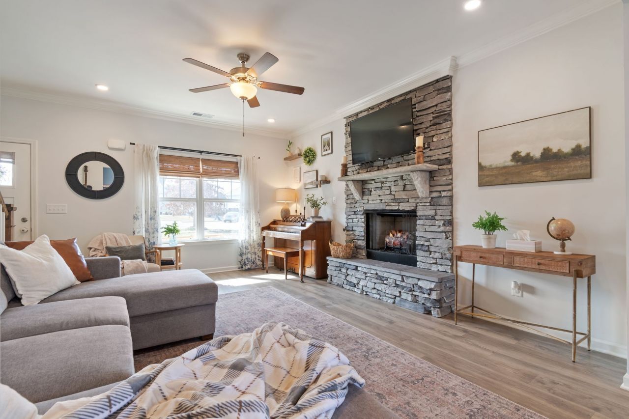 Welcome to your cozy sanctuary in the heart of Cumberland Estates! This stunning 3-bedroom, 2.5-bathroom home perfectly captures the essence of modern craftsman style with a warm, welcoming soul. Built with durable Hardie Plank siding & accented with elegant stone, this home offers timeless beauty and low-maintenance living. The inviting front porch greets you, drawing you into the cozy atmosphere found within. The open-concept living room features a natural gas stone fireplace, ideal for chilly Tennessee evenings. The kitchen is a chef's delight with granite countertops, stainless steel appliances, and a raised bar perfect for morning coffee or casual gatherings. Enjoy the convenience and aesthetic of luxury vinyl plank flooring throughout the main living areas and 9-foot ceilings that add a touch of airy elegance to the homey feel. A spacious owner's retreat features a walk-in closet and a primary bath with a walk-in shower and soaking tub. Two additional bedrooms upstairs offer privacy, each with upgraded closet organizers, ceiling fans, and interior design improvements. The generously sized bonus room offers a space for playdates, movie nights, and a cozy book-nook. The backyard is full of fun, from the step-down patio to the playground and finally the fire pit area, all fully fenced, ready for family barbeques. Located in a peaceful subdivision known for its friendly neighbors, tot lots, sidewalks, and proximity to Bowie Nature Park. Bowie Nature Park offers over 700 acres of trails and lakes. Families will love the convenience of being close to Fairview Elementary, Middle, and High School, all located a short distance away. Enjoy the tranquility of Fairview while being just 30 miles from the vibrant energy of downtown Nashville or the laid-back vibe of Franklin. This move-in-ready gem is more than just a house-it's the place where your next chapter begins.