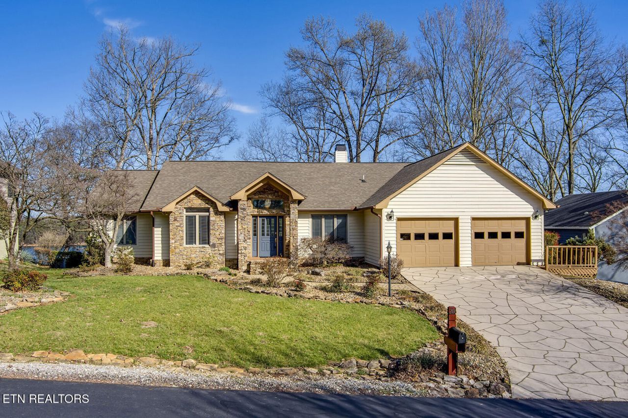 Discover a warm custom-built lake home in Tellico Village, boasting year-round deep water access, a lift, and a boat dock. The exterior features stack-stone and cedar siding, complemented by two levels of Trex decking and a picturesque stone walkway with steps leading to the entrance. Enjoy breathtaking sunrises from this east-facing residence. 8' Sliding door was just replaced to go with a fresh coat of paint has really dolled up this wonderful home. Inside, soaring cathedral ceilings grace the kitchen and living room, where a thoughtfully placed fireplace enhances the ambiance without obstructing the magnificent views. The kitchen offers scenic water vistas in multiple directions, granite countertops, and top-tier KitchenAid, Jet/Air, and Maytag appliances. The main level hosts a spacious master suite, a guest bedroom, and an office that can double as an additional bedroom. Hardwood floors flow through the kitchen, living room, dining room, entry, and hallway, while tray ceilings elevate the master bedroom's sophistication. The master bathroom features double sinks and a wheelchair-accessible shower, paired with a generous master closet. Step into the sunroom--a cozy haven heated by a gas stove and cooled by a fan--overlooking stunning views (note: this room is not included in the square footage). The oversized two-car garage provides ample storage. Downstairs, the lower level offers a spacious family room with a wet bar, a full bathroom, and a versatile all-purpose room previously used as a bedroom by the sellers. The home is equipped with an Aqua Clear water system, ensuring pristine water quality throughout. There is an irrigation system but it does not pull from the lake. A little TLC could make this your Forever Dream Lakefront home! Square Footage is approximate, buyers to verify.