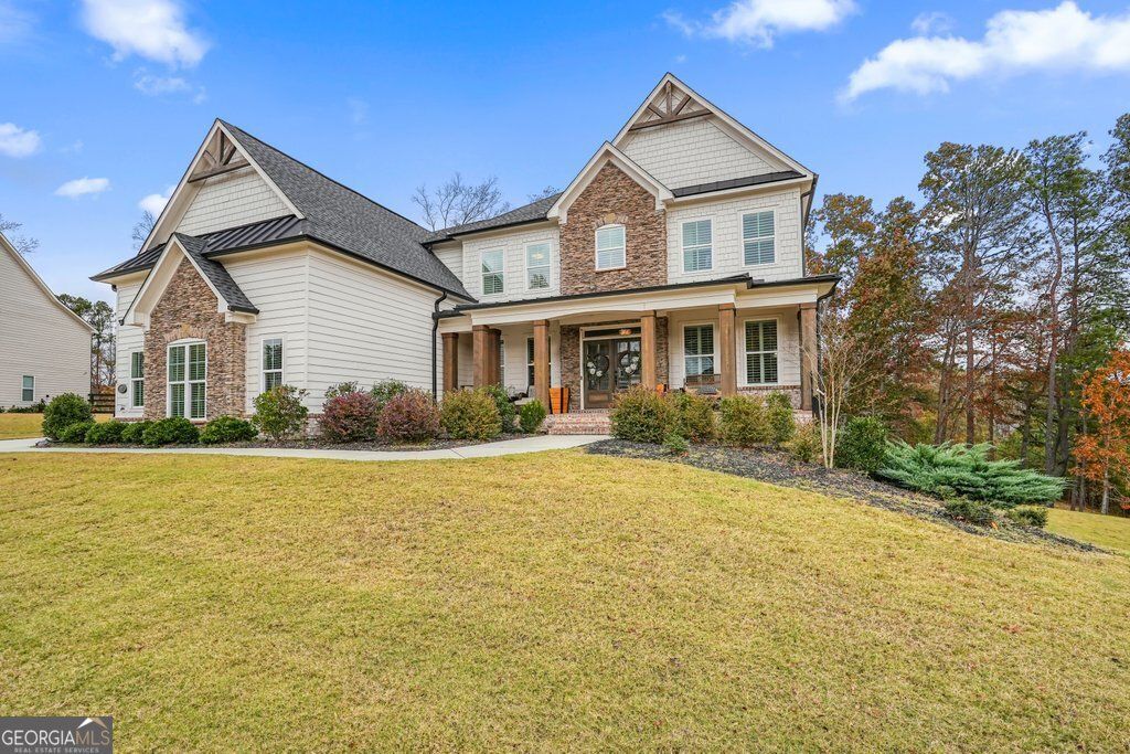 Stunning 5 bedroom, 4 bath Craftsman in the prestigious Milton Overlook community, just minutes from the Milton line. Built in 2021 and situated on a private .9 acre cul-de-sac lot, this home blends timeless design with modern functionality. Impressive curb appeal with stone accents and cedar beams welcomes you into a bright, open floor plan featuring hardwood floors, formal dining room, private office, guest suite on main, and a spacious great room with custom built-ins and floor-to-ceiling stone fireplace. The chef's kitchen showcases custom cabinetry, quartz countertops, oversized island with seating, stainless steel appliances, walk-in pantry, butler's pantry, and coffee bar. Upstairs offers a luxurious primary suite with sitting area and spa-inspired bath, two secondary bedrooms with Jack-and-Jill bath, an additional ensuite bedroom, and a versatile bonus room. The partially finished walkout basement includes a private gym, additional living space, and unfinished area ready for future expansion. Enjoy the open-air deck overlooking the peaceful, tree-lined backyard. The large backyard is a clean slate ready for your vision, and a virtually staged pool concept has been provided to inspire a potential resort-style outdoor retreat. 3-car side-entry garage. Convenient to Milton, Alpharetta, Woodstock, Canton, parks, dining, and top-rated schools.