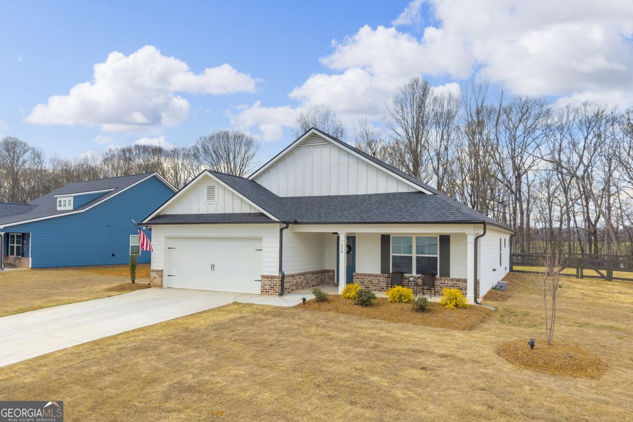 Step into modern farmhouse charm in the highly sought-after Franklin Hills community! This beautifully designed ranch home blends timeless style with everyday comfort and quality craftsmanship. Offering 3 spacious bedrooms and 2 full bathrooms, this inviting home welcomes you with a covered front porch and a covered back patio, creating the perfect spaces to relax or entertain year-round. Inside, the heart of the home is the bright, open-concept kitchen and living area, highlighted by soaring vaulted ceilings and abundant natural light from extra windows. The kitchen is both stylish and functional, featuring granite countertops, classic subway tile backsplash, stainless-steel appliances, an industrial sink faucet, and a freestanding eat-at island-perfect for casual dining or gathering with friends and family. Durable and beautiful luxury LVP flooring runs throughout the main living spaces. The private owner's suite offers a peaceful retreat with a tray ceiling, walk-in closet, double vanity, linen storage, separate toilet room, and a stunning tiled shower with glass door. Homes in Franklin Hills are professionally curated with thoughtfully selected interior and exterior finishes, giving you designer style and low-maintenance living. Location is the finishing touch-just a short walk to Historic Downtown Carnesville, where you'll enjoy local restaurants, parks, playgrounds, a splash pad, ball fields, and the charm of small-town living with everyday convenience. Opportunities like this don't last long. Schedule your private showing today and discover why so many are excited to call Franklin Hills home.