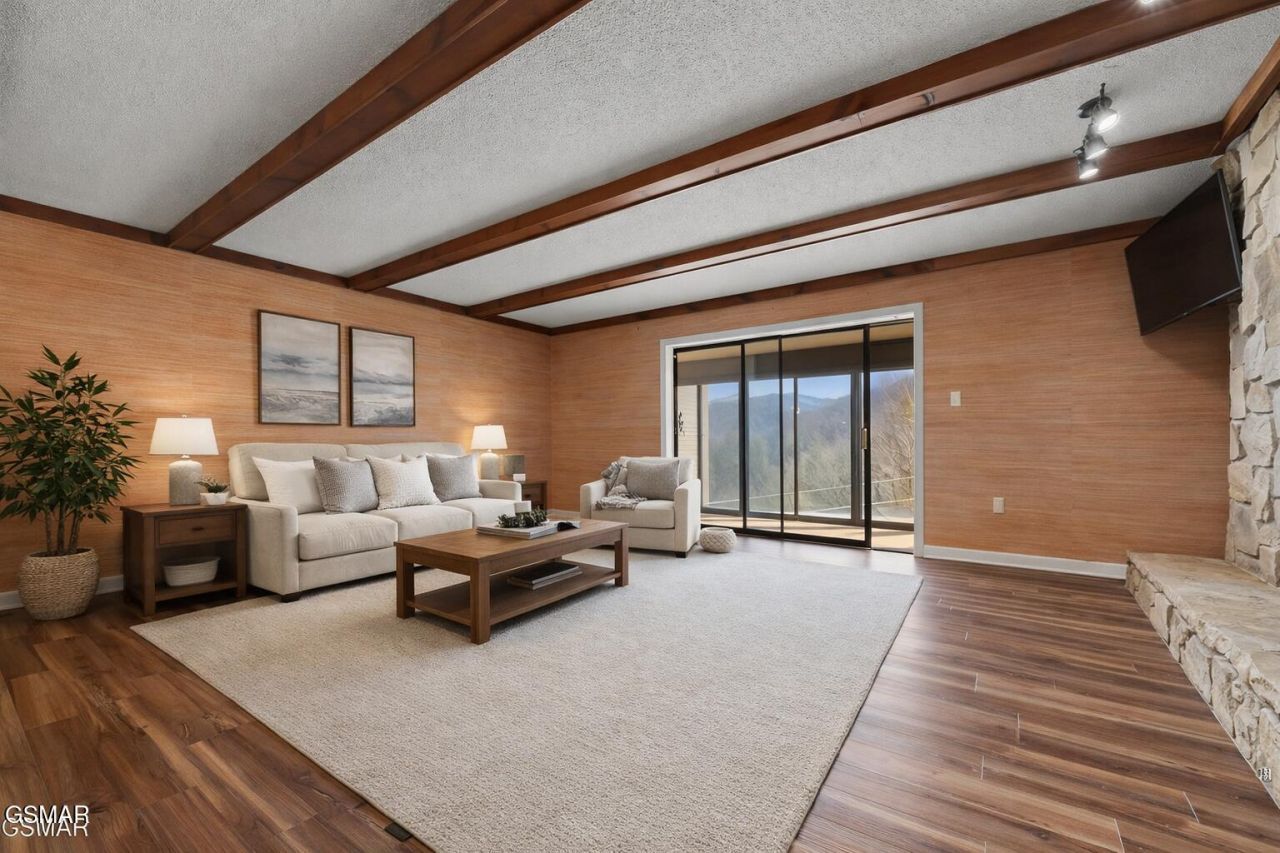 Enjoy amazing views of the Great Smoky Mountains from this beautifully renovated two bedroom/ two bath condo. Just minutes from downtown Gatlinburg, this lower-level unit is located in the desirable Hidden Hills area--NO STAIRS. The great room features new, low-maintenance flooring, a stone fireplace, and exposed beams. An enclosed glass patio is climate-controlled for year round enjoyment. Sliding doors open to green space with a small stone patio. The remodeled kitchen offers solid surface countertops, new stainless appliances, and ample cabinets as well as open shelving. In the spacious master suite, wake up to mountain views! Located between the bedroom and en suite bath is convenient access to an oversized closet and dressing area. The second bedroom also features a large closet, with the second full bath located just down the hall. A central laundry room comes equipped with new washer/dryer and also houses a mechanics room and additional storage. The complex boasts a newly resurfaced in-ground pool, and the unit includes a dedicated covered parking space and assigned storage unit. Permanent residence only; no overnight rentals allowed. HOA fees include cable/internet, water/sewer, trash pick-up, exterior maintenance, and pool!