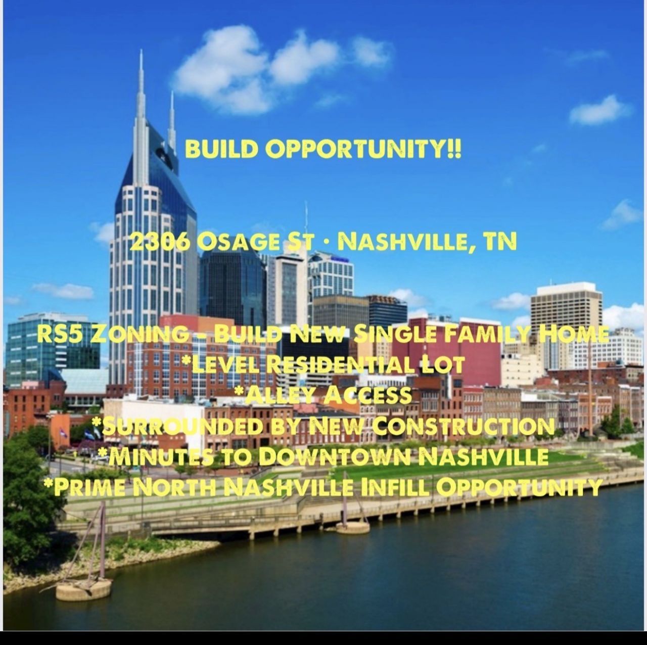 Prime RS5-zoned build opportunity in rapidly developing North Nashville. Surrounded by new construction and redevelopment, this lot offers excellent potential for builders, investors, or custom home construction. Level lot with alley access providing flexible layout and site planning options. Ideally located minutes from Downtown Nashville, Germantown, the Buchanan Arts District, and major interstates. Situated in one of the city's fastest-growing areas where new development continues to drive strong demand.