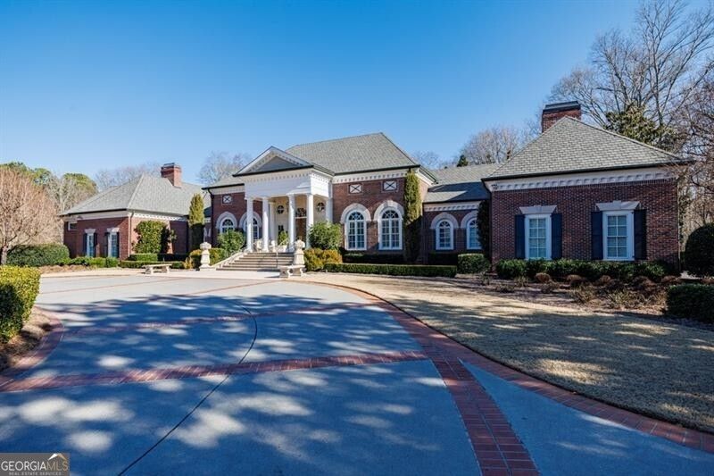 Truly a one-of-a-kind estate set within an exclusive gated enclave of just a few homes. A private gated entrance opens to a long, sweeping driveway framed by a rolling front lawn, twin ponds-one on each side-and a charming gazebo. The circular drive leads to a stately columned front porch and striking double doors. Inside, a grand foyer welcomes you with beautiful stone flooring and exquisite crown molding. The main level features expansive living spaces designed for effortless entertaining. Formal living and dining rooms anchor the front of the home, while the kitchen opens seamlessly to the breakfast room and great room with fireplace. A richly appointed wood-paneled study showcases custom built-in bookcases and its own fireplace. The most captivating spaces are the two rear rooms overlooking the grounds and pool: one a glass-enclosed sunroom filled with natural light, the other mirroring its design as a screened retreat-both ideal extensions of the great room and kitchen for entertaining and relaxation. The primary suite, occupying the entire left wing of the home, is a private sanctuary featuring a gracious sitting room and direct access to the indoor pool. The suite boasts a tray ceiling, fireplace, and a spacious bath with serene views of the pond and gazebo. Two separate walk-in closets offer exceptional storage, complemented by dual vanities, a large shower, soaking tub, and two water closets. The upper level offers three generously sized bedrooms, each with an en-suite bath, along with a large bonus room currently used as a media room. A secondary staircase provides convenient access to the kitchen and garage. The finished terrace level is ideal for entertaining, with multiple living areas and a kitchen opening to the pool and grounds. A full wellness center includes a sauna, pool bath, exercise room, and massage room. Outdoors, enjoy the poolside covered gazebo with fireplace. Spanning over 21 acres, the property also includes two ponds, multiple gazebos, a shed, and a detached two-car garage. Offering exceptional privacy while located just 15 minutes from downtown Alpharetta and close to Milton, this extraordinary estate is truly a must-see.