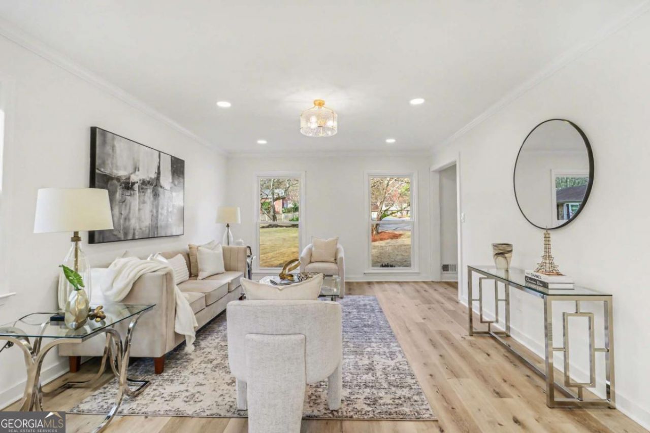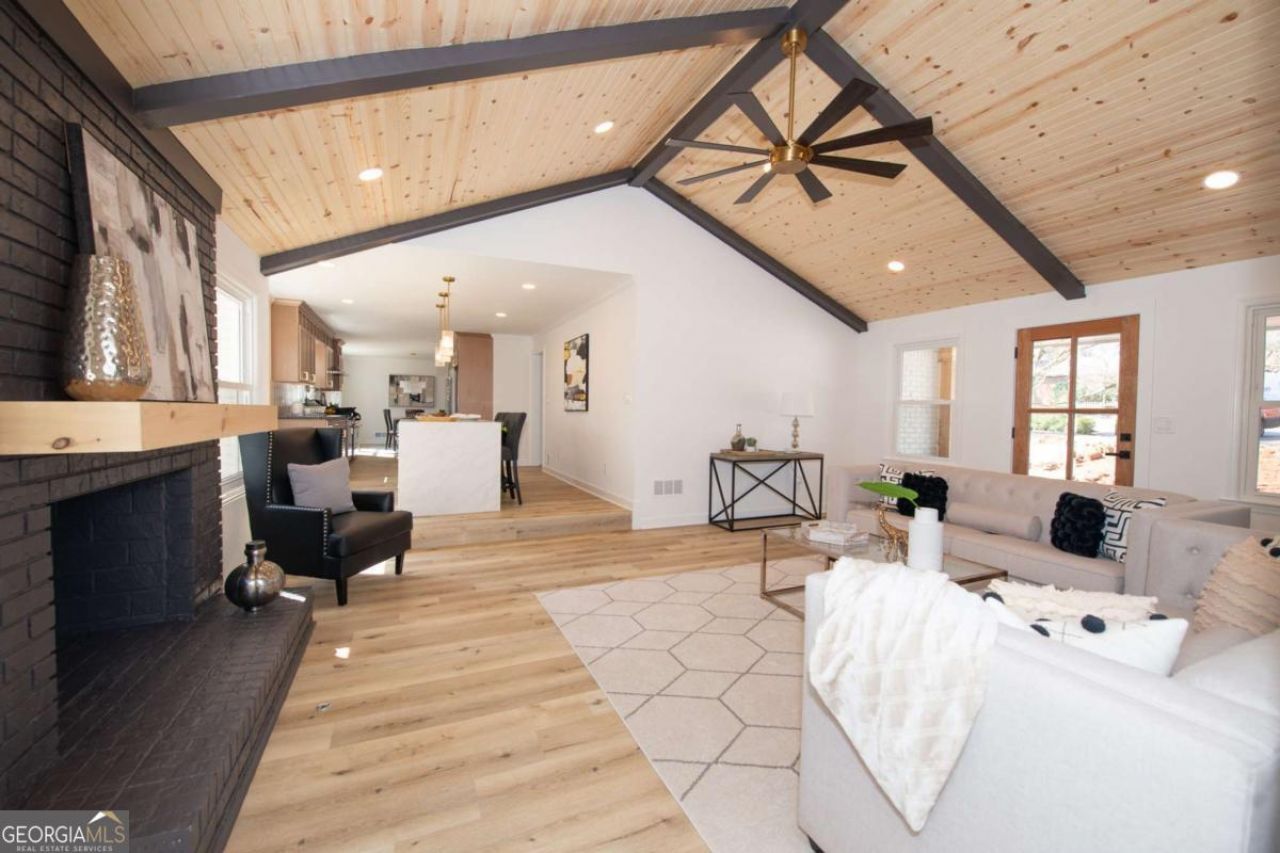Completely renovated from top to bottom, this stunning five-bedroom, three-bath Dunwoody home blends modern luxury with thoughtful design and multiple inviting front porches, including a charming rocking-chair porch off the living room. Major upgrades include a new roof, energy-efficient double-pane windows, new HVAC, hot water heater, driveway, and garage door. The designer kitchen features shaker-style soft-close cabinetry, quartz countertops, a large statement island, and top-of-the-line appliances including a 36-inch gas/electric range cooktop and microwave drawer, all opening to a spacious great room with a wood-burning fireplace, tongue-and-groove ceiling accents, and a stylish wet bar with custom wallpaper and brass fixtures. An expansive deck off the living room overlooks the private backyard and lake and is ideal for entertaining, while lake views can be enjoyed from all rear windows of the home. A main-level guest room doubles as a perfect home office. The primary suite offers a custom walk-in closet and spa-like bath featuring dual vanities, soaking tub, and a luxurious walk-in shower with multiple shower heads, including a rain shower head and accent lighting. The finished basement adds a large living area, bedroom, and flexible space ideal for a gym or media room. Additional highlights include LED lighting throughout, Wi-Fi thermostats, custom closets in all bedrooms, and a large laundry/mud room, all conveniently located near I-285, I-85, Dunwoody, and Brookhaven.