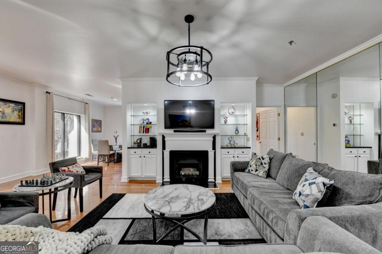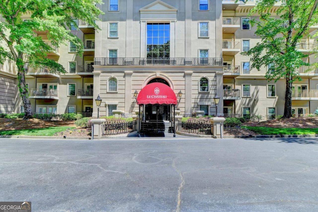 Welcome home to this Lenox Road gem in the heart of Buckhead. Nestled within the gated Le Chateau community, this elegant residence offers two deeded garage parking spaces, 24/7 concierge service, and resort-style amenities including a saltwater swimming pool, community grill, fitness center, business center, and beautifully landscaped, pet-friendly green spaces. Step inside this end unit to gleaming hardwood floors and expansive windows that flood the home with natural light. The inviting living room features a gas-log fireplace framed by custom built-in bookcases with glass shelving-perfect for cozy evenings or stylish entertaining. The updated kitchen shines with granite countertops, stone backsplash, and stainless steel appliances, including new refrigerator, and includes a pantry, breakfast area, and additional built-in storage. Just beyond, the private balcony overlooks serene pool and garden views. The dining area sits adjacent to the kitchen and is wrapped in large windows, creating a bright and airy setting for everyday meals or special occasions. The oversized primary suite offers dual walk-in closets and a spa-inspired ensuite with double vanities, jetted soaking tub, separate shower, linen closet, and tile floors. A second bedroom-ideal for guests or a home office-features its own full bath and double closets. The laundry is conveniently located nearby, and a powder room welcomes guests off the entry hall. Updated light fixtures throughout add a modern touch. This non-smoker, pet-free home has been lovingly maintained. Enjoy unbeatable convenience just minutes from Lenox Mall, Phipps Plaza, Salesforce, and major Buckhead employers-shorten your commute and elevate your lifestyle. HOA fees include gas, internet, cable, trash, and all amenities. Brand new refrigerator. Two dedicated parking spaces.Guest parking is available in front. Elegant, inviting, and centrally located-this is Le Chateau living at its finest.