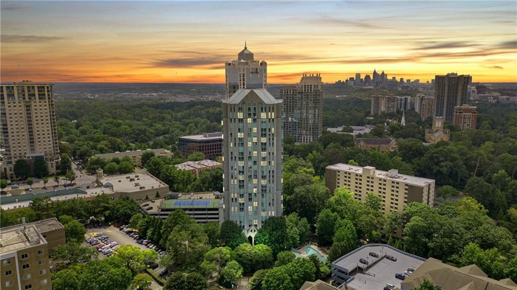 Experience refined high-rise living at The Concorde, one of Buckhead's most iconic residential towers, known for its distinctive architecture and full-service amenities. This meticulously maintained two-bedroom, two-bathroom residence showcases timeless design, thoughtful details, and an effortless flow ideal for both everyday living and entertaining. The home features hardwood floors throughout, custom arched doorways, and expansive floor-to-ceiling windows that flood the living spaces with natural light while framing sweeping city and skyline views. The open living and dining areas feel both warm and inviting, enhanced by custom lighting wired throughout. A built-in wet bar integrated into the breakfast bar, along with a corner bar display, adds a distinctive and functional touch, perfect for entertaining or creating a dedicated cocktail space. The kitchen is open to the main living area and offers a practical, functional layout with ample storage and the convenience of an in-unit washer and dryer. Both bedrooms are generously sized, each with spacious walk-in closets and en-suite bathrooms, offering the flexibility of dual primary suites or a comfortable guest and home office setup. Residents of The Concorde enjoy a full suite of resort-style amenities, including 24-hour concierge service, a state-of-the-art fitness center, tennis courts, swimming pool, dog park, and secure gated parking. Lush landscaped outdoor spaces and multiple controlled access points provide both comfort and peace of mind. Located in the heart of Buckhead Village, this home places you just moments from premier shopping, acclaimed dining, and vibrant nightlife, offering the ideal balance of urban convenience and private retreat. A well-cared-for residence with classic character and thoughtful features in one of Atlanta's most established luxury high-rises.