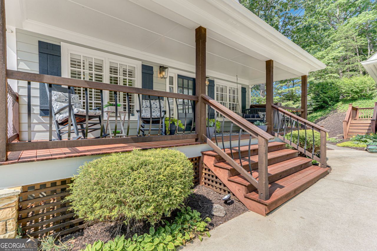 Discover the perfect blend of charm and functionality in this spacious craftsman home on Lake Lanier, offering plenty of room for family and friends! Thoughtfully designed with a resort-style feel, this property features two great rooms with stone fireplaces, two kitchens, and four covered porches ideal for entertaining in every season. Located in a prime Dawsonville spot just 30 minutes north of Atlanta and 15 minutes south of the Dahlonega wineries and fall festivals, this home is nestled in a secluded Lake Lanier neighborhood. Tucked away behind gates in a private three-home enclave, it sits just steps from the water on a protected deep-water cove. Enjoy easy lake access from your private twin-slip dock with a party deck perfect for sunbathing and gatherings, with calm waters ideal for swimming and floating. Inside, the main level features an open floor plan with a two-story vaulted ceiling and stone fireplace, hardwood floors, a spacious kitchen with an island, two bedrooms, and a full bath. The upstairs owner's suite includes a loft sitting area, ideal for a reading nook or office space, and offers serene views. The finished terrace level mirrors the main level layout, complete with a second kitchen, two bedrooms, and a full bath perfect for guests or multi-generational living. The unfinished daylight basement offers even more potential for game rooms, storage, or lake toys. A detached two-car garage with an upstairs storage room adds extra flexibility. With ample parking for trailers and visitors, the shared gated driveway serves just three homes. No HOA, but residents share annual maintenance costs (approximately $600-700 per year) for the gate and common landscaping. Ideal for full-time living or Airbnb potential, this home offers a unique opportunity to enjoy the best of lake life!