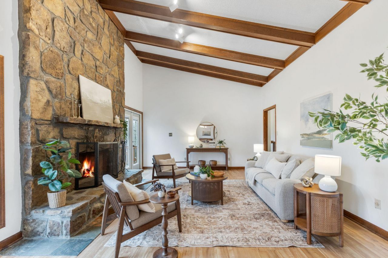 *First 48 Right*This 3,400 sqft mid-century modern home has 1,934 sqft on the main living level and 1,466 sqft in the walkout ground floor level. This unique home marries indoors and outdoors through decks, patios, and a screened-in porch, which expands the living area substantially. The home features 3 bedrooms on the main floor and a fourth bedroom (which can also be used as an office) on the lower level, with a walk-in closet and full bath adjacent. The ensuite primary bedroom has a large walk-in closet and deck. The second bedroom also has a walk-in closet, deck, and attached bathroom. There is ample closet space in the third bedroom.The kitchen has a walk-in pantry, stainless steel appliances, extensive cabinets, and a breakfast area. Off of the kitchen, there is a screened-in porch, perfect for outdoor dining.The fabulous great room has vaulted ceilings with beams, a wood-burning stone fireplace, great circulation into the dining room, and opens onto a large elevated deck. There are spectacular sunrises and mountain views.The expansive ground floor den has a wood-burning stone fireplace and wet bar. This space opens onto both a covered patio and a brick terrace. You can access the main floor deck from the ground floor patios. This level also features a full bath, laundry room, and a bedroom/flex space with a walk-in closet.There is a two car garage with a substantial workshop space. In addition to the wonderful patios and decks, there is a wood burning firepit that enhances your outdoor living space.The home seamlessly flows between indoor/outdoor spaces and mountain views that must be experienced in person! Come see!