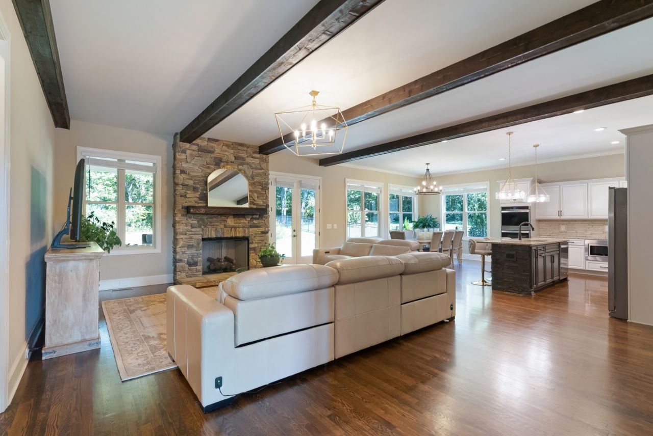 Distinguished Bridgemore Village! Backs to Trees! This 4-bed, 4.5-bath home is made for living and entertaining w/ ease and in style. Open-concept living space features wood beams, hardwood floors, and panoramic windows that fill the home with light, all set against a neutral palette. A double-sided, floor-to-ceiling fireplace steals the show while anchoring the living room and creating a warm, inviting centerpiece. Space in the living area is overgenerous, allowing for multiple types of furniture arrangement. Kitchen has granite countertops, abundant cabinets, a gas stove, double ovens, and a dining area large enough for parties, family dinners, or casual breakfasts. Oversized primary suite is a luxurious retreat w/ private access to the outside covered porch. Sizable primary bath features a walk-through shower w/ multiple shower heads, freestanding, oversized bathtub, and separate water closet. Every bedroom is ensuite, w/ granite countertops, tubs, and showers in each. Two bedrooms, including the primary, are conveniently located on the main floor. In addition to two bedrooms, upstairs you'll find a huge bonus room w/ wet bar and built-ins, additional hobby/flex room, and unfinished storage for everything you need to tuck away. Outdoor living abounds w/ a covered back porch w/ fireplace, additional patio, and large fenced yard w/ mature hardwoods. This gorgeous yard is begging for a POOL! Upscale light fixtures and a 3-car garage w/ man-door complete this meticulously maintained home. Front porch views of the rolling Tennessee hills and proximity to top-rated elementary and middle schools make this a rare find-a home built for both hospitality and rest. The neighborhood offers two community pools, kiddie pool, pavilion, playground, basketball court, miles of scenic walking trails, and sidewalks throughout.