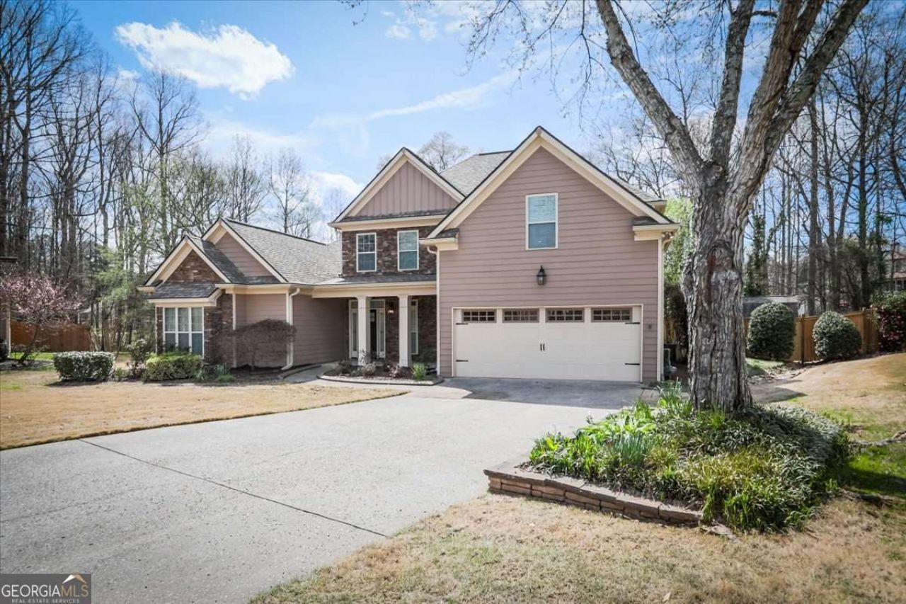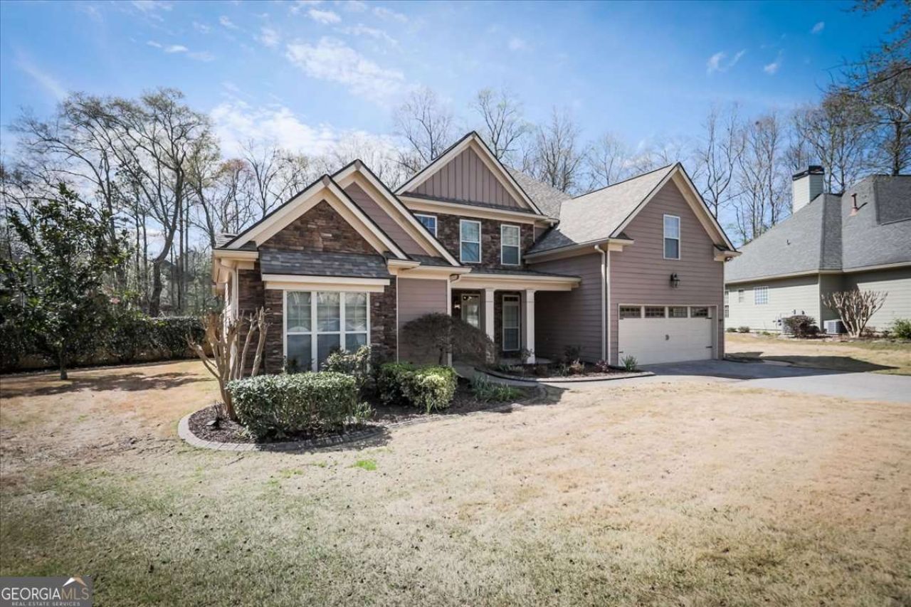 Beautifully maintained one-owner Craftsman-style home offering timeless design, quality upgrades, and a highly convenient location with easy access to Hwy 278. The drive into the neighborhood passes a charming wooden-fenced farm, creating a peaceful approach that feels tucked away while still close to everyday conveniences. A stepless entry leads to a striking Craftsman front door with leaded glass sidelights and transom, while the covered front porch showcases stacked stone accents that create an inviting architectural presence. Inside, a soaring foyer and living room ceiling highlight the home's open floor plan, allowing natural light to pour through oversized windows accented by elegant half-moon transom windows above the fireplace. Hand-scraped engineered wide-plank hardwood floors run throughout the main living areas, adding warmth and character. The open dining area provides ample space for a large table or statement furniture and flows seamlessly into the chef-inspired kitchen. Designed for both everyday living and entertaining, the kitchen features granite countertops, upgraded maple cabinetry, a corner sink layout, and a spacious island with additional seating and storage. Premium stainless steel appliances include double ovens, gas cooktop, Bosch dishwasher, and French-door refrigerator. Ceramic tile flooring extends into the nearby laundry room, which includes built-in cabinetry and a utility sink. The main-level primary bedroom offers a peaceful retreat with a double tray ceiling and private access to the patio. The spa-style bath features separate vanities, a jetted soaking tub with tile surround, and a beautifully tiled glass-enclosed shower. The staircase is accented with wrought iron balusters leads to the upper level, where an open loft/office space overlooks the living area below. Three additional spacious bedrooms with large closets share a well-appointed hall bath with double vanities. Outside, the professionally landscaped front yard features defined garden beds and seasonal blooms, creating excellent curb appeal. The fenced backyard provides privacy for outdoor enjoyment including patio, with the property line extending beyond the fence for additional space. Additional highlights include a garage with interlocking tile flooring, convenient access from the kitchen, and a roof featuring durable architectural shingles. Ideally located near the Silver Comet Trail, this home is also close to shopping, dining, recreation, and commuter routes, offering both tranquility and accessibility.