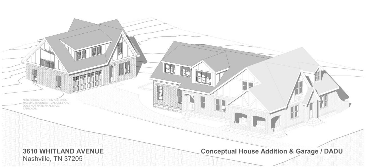 This versatile property is located on one of Nashville's most sought-after streets, offering views of Elmington Park and West End Middle School. This beautifully maintained historic home presents a unique opportunity for enhancement, expansion, or the addition of new structures, making it an ideal choice for multi-generational living. Explore one of the proposed plans for a garage apartment, pool, or other addition up to 26 feet tall, with architects' renderings available in the photos. The property features a charming 2,647 sqft brick and stucco Tudor home with 5 bedrooms, 2.5 baths, hardwood floors, arched doorways, and a fireplace. On the main level, you'll find 3 bedrooms, 1.5 baths, a formal living and dining room, an updated kitchen with an island, a 200 sqft covered side porch, a stone back patio, and a spacious backyard. The second level includes a second kitchen, a two-room bedroom suite, a second bedroom, a full bath, and a versatile area for sitting, dining, or exercising.Additionally, there's a walk-out, walk-around basement/storm shelter of approximately 1,450 sq ft, unfinished, with access from both the first floor and the backyard. Walkable to multiple houses of worship, schools, parks, and greenways, The driveway is composed of asphalt, tar, and chip. Any new structures or additions will require Historic Zoning approval. Improvements to the Bowling/Whitland intersection have significantly calmed and reduced traffic patterns, enhancing the tranquility of the area. The sale includes the existing home known as 3610A Whitland, Parcel ID #104090Q00100, as well as 3610B Whitland, Parcel ID #104090Q00200, an unimproved backyard lot, and the surrounding common area, 3610C Whitland, Parcel ID #104090Q00300. Recent tax assessments can be viewed in the media section. Owner/Agent