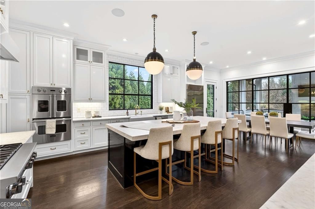 From the moment you step into this exquisite Vinings residence-offering 6 bedrooms, 5 full baths, and 2 half baths-you are immediately struck by the exceptional attention to detail and sophisticated design throughout. The impressive entry foyer showcases extensive custom trim work and opens to a beautifully curated formal study featuring rich suede wallcovering and bespoke built-in bookcases. The living room is bathed in natural light from a dramatic wall of windows and provides tranquil views of the serene outdoor water feature. The chef's kitchen is a true showpiece, appointed with custom cabinetry, marble countertops, Circa lighting, Viking and Sub-Zero appliances, Waterworks plumbing fixtures, a beverage station, and an oversized eat-in area capable of accommodating a banquet-sized dining table. Just off the kitchen are a spacious pantry, laundry room, and a separate mudroom for added convenience. The main-level primary suite offers peaceful views of the backyard and a luxurious ensuite bathroom designed for comfort and privacy, complete with Waterworks fixtures, a spa-like soaking tub, an expansive walk-in shower, separate vanities, and separate water closets. A screened-in porch with an outdoor fireplace extends the living space outdoors, creating the perfect setting for year-round enjoyment. A stunning staircase highlighted by a feature wall and detailed trim work leads to the upper level, where you'll find a comfortable family room, a second owner's suite, two generously sized secondary bedrooms with private baths, and an additional bedroom ideal for a home office, music room or playroom. The terrace level is an entertainer's dream, featuring a large flex space with walkout access to the garden and water feature, a second beverage station, a fully equipped home theater with projector, screen, and surround sound, and a private guest suite with full bath-currently utilized as a gym. Located just 0.3 miles from Vinings Jubilee, this exceptional residence seamlessly blends luxury, comfort, and thoughtful design throughout.