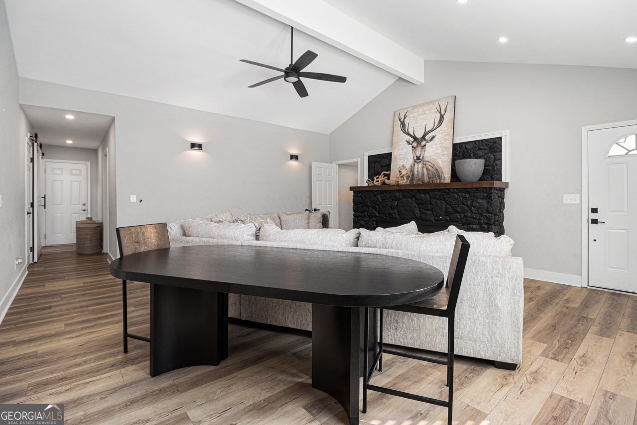 Welcome to 3795 King Edward Trail SW, a completely renovated home nestled in a quiet and desirable Atlanta neighborhood. This home has been completely renovated from the studs up, offering a true like-new living experience. It features soaring vaulted ceilings, sleek quartz countertops, stainless steel appliances, and modern recessed lighting throughout. Every major component has been replaced, including new plumbing, electrical, gas lines, LVP flooring, bathrooms, kitchen, drywall, HVAC system, interior and exterior paint, fireplace, gutters, roof, windows, doors, blinds, porch railing, and deck. This spacious residence offers the perfect blend of comfort, style, and functionality. Step inside to find an inviting open floor plan with abundant natural light that enhances the warm and welcoming atmosphere. The main level features a generous living area with a cozy fireplace, ideal for both relaxing and entertaining. The kitchen is equipped with modern appliances, ample cabinet space, and a breakfast area perfect for casual dining. The primary suite offers a peaceful retreat with a large walk-in closet and a private ensuite bath. Additional bedrooms are well-sized and versatile for guests, family, or home office needs. Outside, the private backyard and deck create an ideal setting for outdoor gatherings and quiet evenings. The backyard provides endless possibilities-perfect for a pool, an ADU or tiny home for additional income, or your own private outdoor retreat. Conveniently located near shopping, dining, parks, and major highways, this home combines suburban tranquility with easy access to all that Atlanta has to offer.