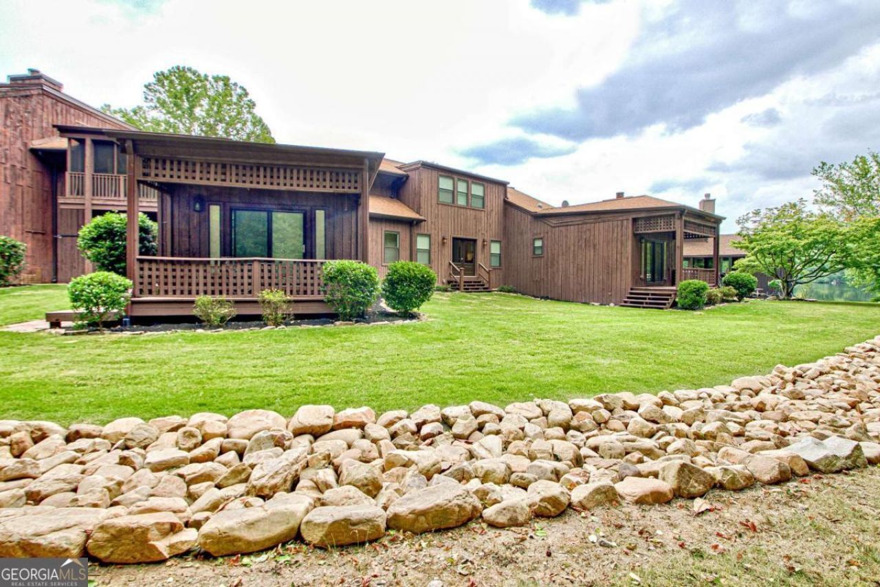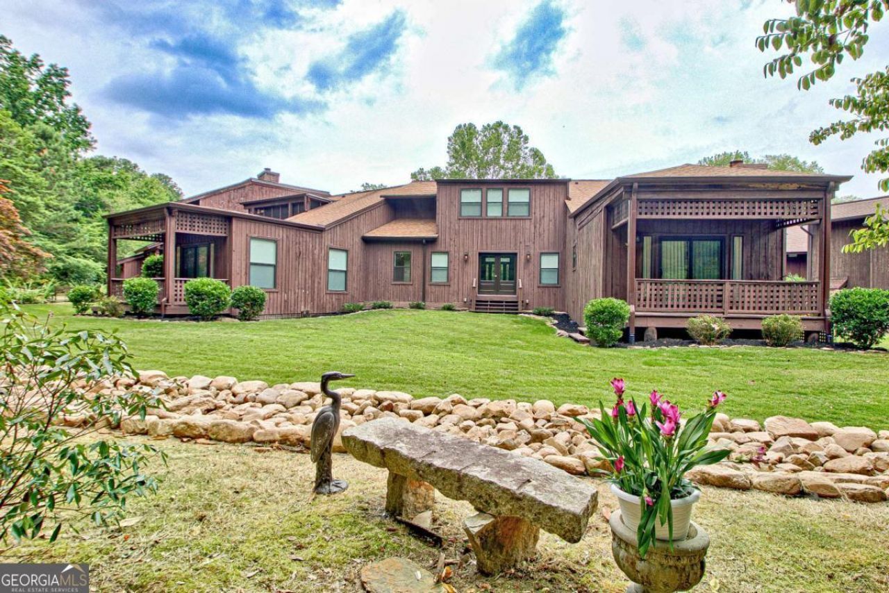 These two condo units have been seamlessly combined, to one large home. The main floor features a massive primary suite with its own private entrance, full laundry, private porch, sitting area with wet bar, gorgeous stone tile shower and walk-in closet. Foyer at main entrance showcases a temperature controlled wine room, half bath and French doors leading to the back yard. Open and inviting kitchen with large island and plenty of seating, breakfast nook, large pantry, and subzero refrigerator. Kitchen over looks the lower living room with lake views, fireplace and sliding doors to back covered patio. Upstairs includes full laundry, open space for media, office, etc. and 3 additional bedrooms - two bedrooms share a shower, both having their own toilets and sinks. The third bedroom is an upstairs primary suite with its own full bath with tub, water closet, private screened in balcony and large walk-in closet. Other interesting features - Beautiful sidewalk pavers surround both units. Water redirection to 5 catch basins below the home directing water to riverbed leading to the lake. Exterior storage space off the breezeway of unit #4. This truly is a must see to believe property, located in the most central Peachtree City location, McIntosh school district, close to the airport, and movie production hub of Fayette County.