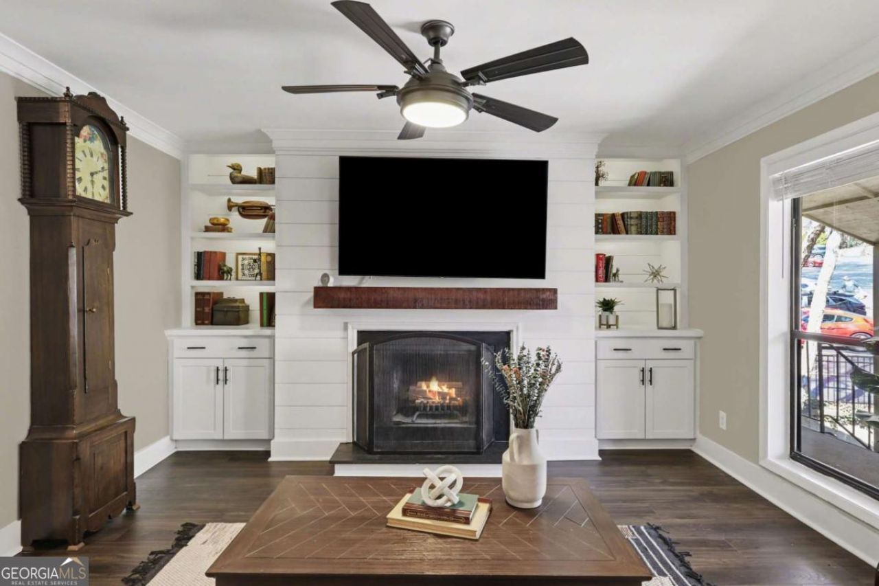 Tucked inside a gated Roswell community just minutes from GA-400, Canton Street, and the natural beauty of the Chattahoochee River corridor, this thoughtfully updated condominium offers the perfect blend of comfort, style, and convenience. Step inside and you'll immediately notice the clean, modern feel created by smooth ceilings, luxury vinyl plank flooring, and carefully selected finishes throughout. The inviting family room centers around a beautifully refreshed fireplace framed with shiplap and custom built-in bookcases, creating a warm and welcoming space to unwind or entertain. The kitchen has been stylishly refreshed with sleek shaker-style cabinetry, granite countertops, stainless steel appliances, under-cabinet lighting, and a tile backsplash that adds just the right touch of character. Updated bathrooms feature ceramic tile flooring, tile showers with glass doors, and modern Delta fixtures, while spacious walk-in closets provide plenty of storage. Step outside onto the private deck overlooking a peaceful wooded backdrop-an ideal spot for morning coffee or quiet evenings surrounded by nature. Residents also enjoy the benefits of a gated community with swim and tennis amenities, all while being close to Roswell's vibrant dining, shopping, and outdoor recreation. Homes in this location rarely combine privacy, thoughtful updates, and lifestyle convenience quite like this one-making it a must-see opportunity in the heart of Roswell.