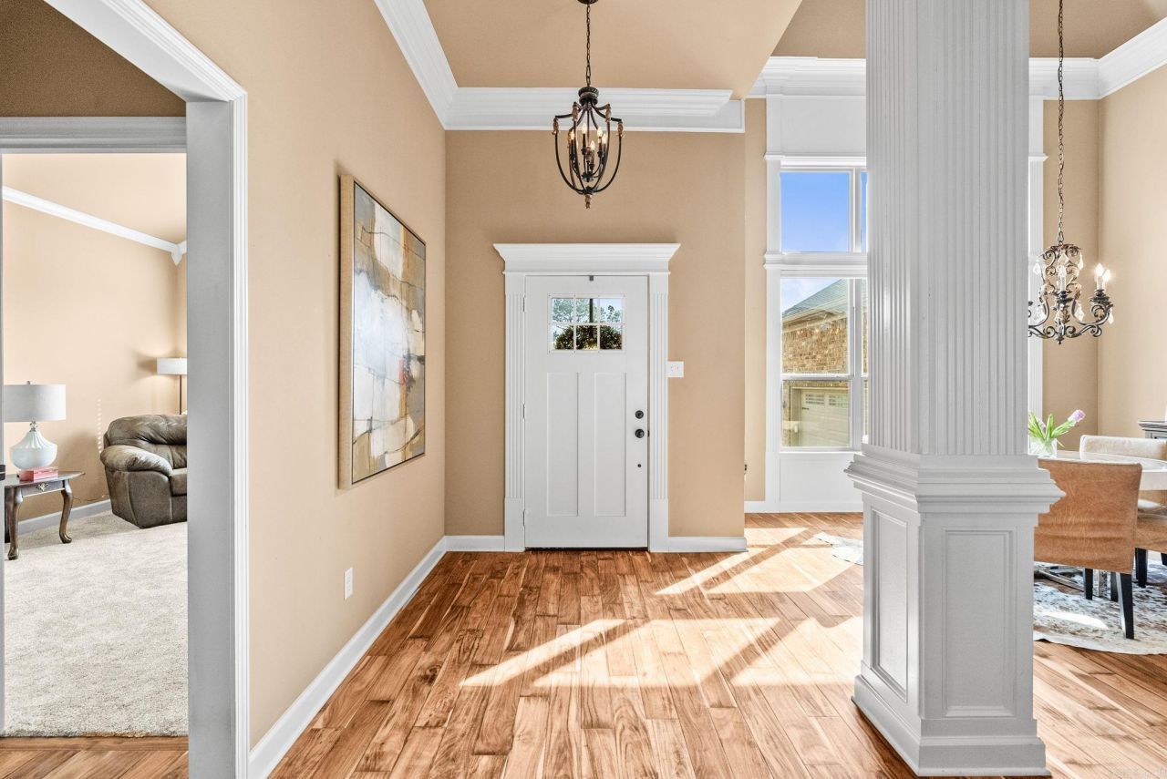 Discover modern luxury at this 2016-built gem in the established Villages of Wellington community. This West Little Rock home features a one-story open floor plan with hand-scraped hardwood floors and vaulted ceilings in the living and dining area that includes a fireplace and large island with slab granite countertops. The massive primary suite is a true sanctuary, boasting hardwood flooring, a spa-like bath with a soaking tub, dual vanities, and a generous walk-in closet. Guests will appreciate the comfort of brand-new carpet in the secondary bedrooms. Outdoor living is a dream on the private covered back patio featuring upgraded stamped and stained concrete. Complete with a spacious side-load garage, this home offers both style and function on a private cul-de-sac. Residents enjoy premier neighborhood amenities, including a pool, tennis courts, and playground. Positioned perfectly near The Promenade at Chenal, you are just minutes from the best the area has to offer. Enjoy your weekends with a stroll to the nearby pond, local shopping and dining, or relaxing on your private patio.