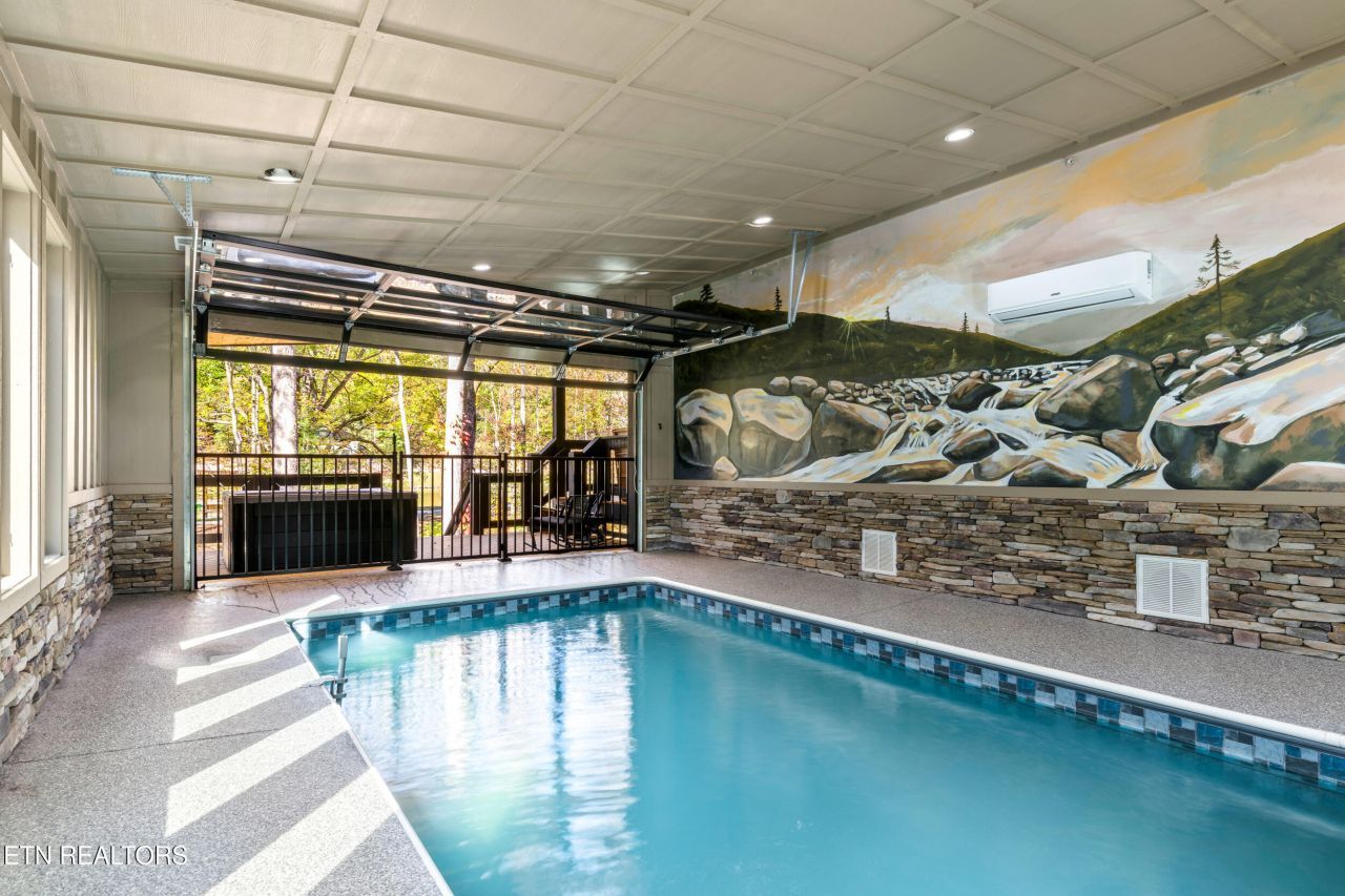 Discover the ultimate Smoky Mountain retreat! An upscale, fully furnished, creekside cabin where modern architecture meets rustic elegance and nature's soundtrack plays on repeat. Professionally designed and equipped with a full indoor sprinkler system for peace of mind, this five-bedroom, five-bath sanctuary welcomes guests with a soaring two-story stone fireplace, sleek finishes, and tranquil wooded views. Two expansive decks overlook the rushing creek, while a glass-enclosed indoor/outdoor pool and inviting fire pit invite endless moments of play and relaxation. Inside, every bedroom features a private ensuite bath with custom-tiled showers, and a charming nook under the stairs offers a whimsical hideaway for kids, stocked with games and books. A theater room promises cinematic evenings, and city water and sewer provide modern comfort without sacrificing mountain charm. Just minutes from Gatlinburg and Pigeon Forgeâ?¬'and less than a mile from the Gary Player-designed Bent Creek Golf Courseâ?¬'this property delivers both luxury and location. Blending high-end design, family-friendly amenities, and an unbeatable natural setting, this cabin is not just a getawayâ?¬'it's an unforgettable experience and a rare investment opportunity in the heart of the Smokies.