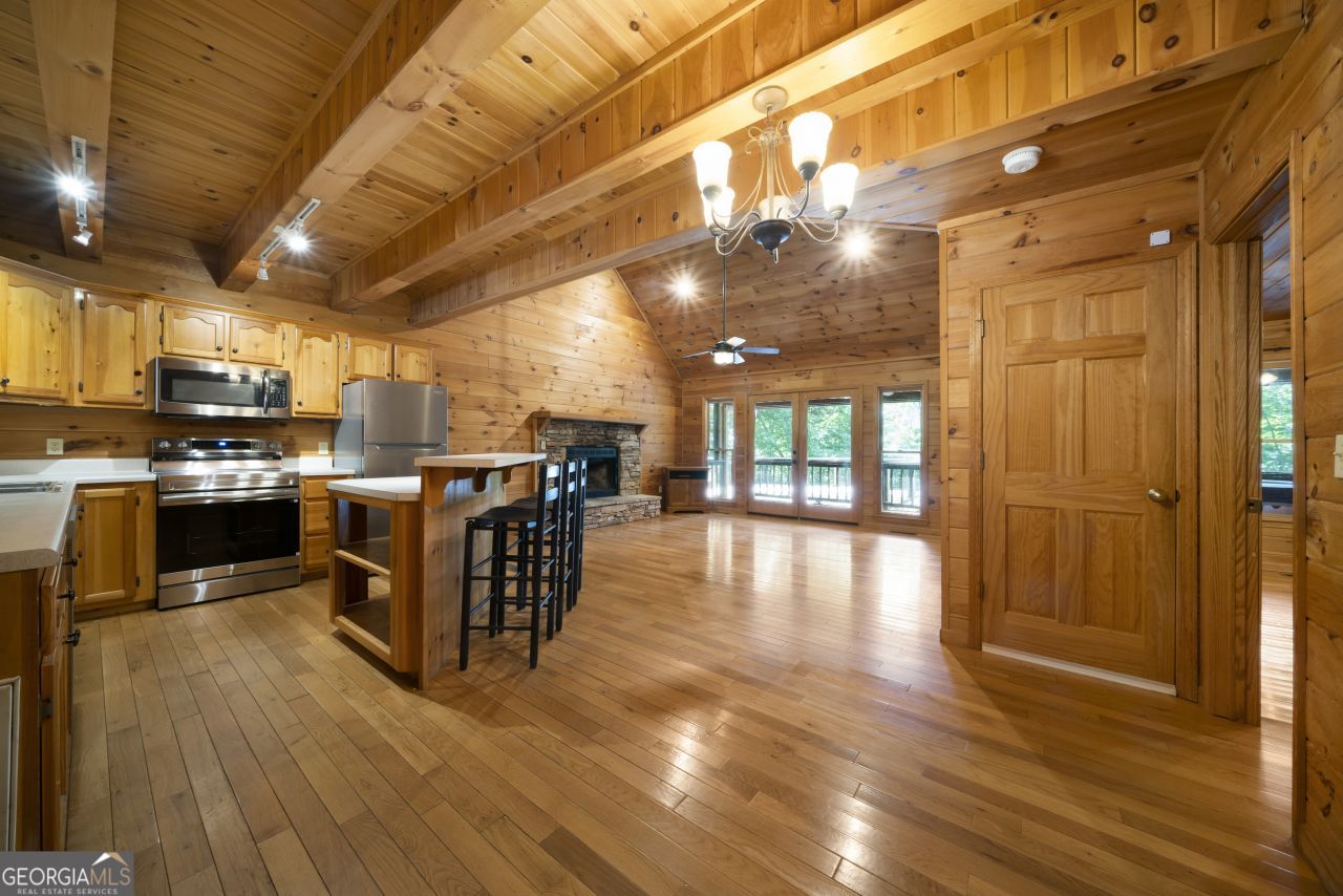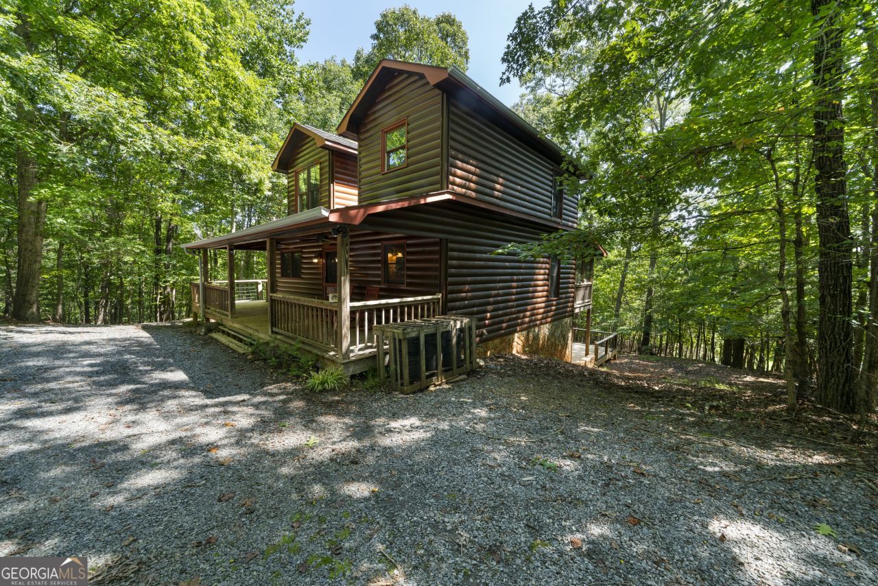 Escape to your private mountain sanctuary in the coveted My Mountain community! With the convenience of all-paved roads, you're just a scenic 10-minute drive from the vibrant shops and dining of downtown Blue Ridge. This immaculate, move-in ready log cabin is a rare find, perfect as a peaceful retirement haven, a multi-generational family retreat, or a high-demand short-term rental investment. Step inside and be greeted by the warmth of a spacious great room, where a crackling wood-burning fireplace invites you to unwind. The open-concept layout flows seamlessly into a modern kitchen, fully updated with brand-new stainless steel appliances. The main level also features a convenient primary bedroom with a full ensuite bathroom, complete with dual 'his & her' sinks. Ascend to the upper level to discover a second private bedroom suite, also boasting a full ensuite bath and double vanities, offering a perfect retreat for family or guests. The fully-finished terrace level is a game-changer, featuring a complete in-law suite ideal for extended stays or as a separate rental unit. This versatile space includes a cozy living area with a gas log fireplace, a brand-new kitchenette, a sleeping area, and a full bath. Your outdoor oasis awaits! Entertain and relax on the brand-new, two-story deck, perfect for grilling while overlooking your private, wooded lot. Spend your evenings sharing stories around the newly built stone fire pit or soaking in the hot tub on the peaceful, screened-in porch-a true year-round luxury. With recent major upgrades, an ideal location, and a floor plan built for comfort and income, this is the Blue Ridge opportunity you've been waiting for. Don't let this dream slip away. Schedule your private showing today and start living the mountain life!