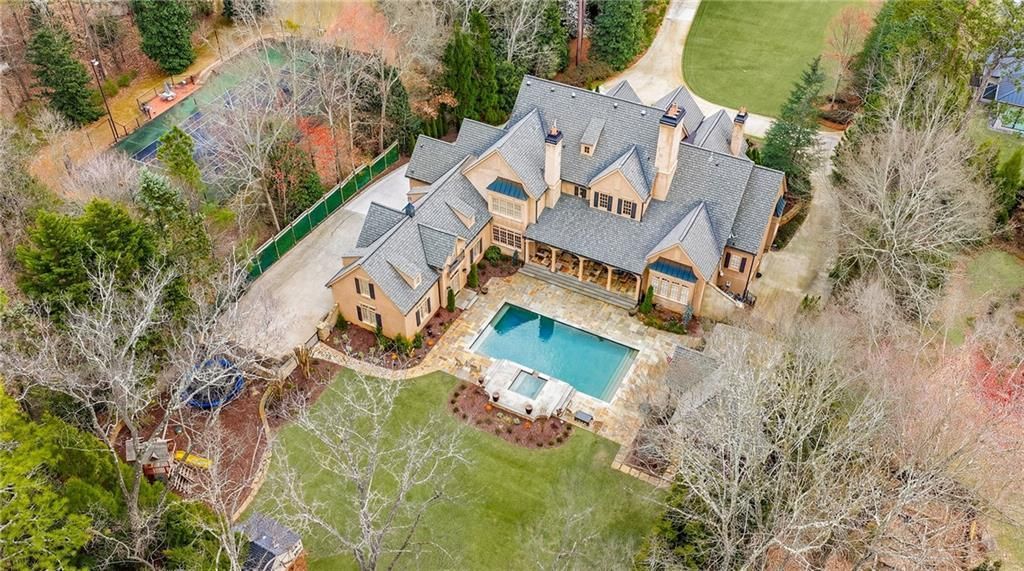 Set behind gates on an extraordinary 2.2-acre estate just moments from Atlanta Country Club, this custom residence by renowned builder Steve Edison evokes the timeless charm and romance of a Provençal countryside villa, while offering the scale, comfort, and technological sophistication expected in a modern luxury estate. Approached by a winding drive through meticulously landscaped grounds, the home unfolds with an immediate sense of arrival. The elegant hardcoat stucco exterior, classic proportions, and manicured gardens create a setting reminiscent of a private European retreat. Inside, a dramatic two-story foyer with sweeping circular staircase?one of three staircases within the residence? establishes the home's architectural presence. The interiors balance grand scale with warmth and livability, offering expansive yet inviting spaces. The main-level owner's suite serves as a private sanctuary overlooking the estate grounds, complete with custom wardrobe closets and a recently renovated marble bath. A fireside library/study with bespoke built-ins provides an ideal executive workspace or quiet retreat. Entertaining spaces include a gracious dining room and multiple fireside gathering rooms that flow effortlessly throughout the main level. The newly renovated chef's kitchen anchors the home with sleek cabinetry, integrated professional appliances, striking Neolith countertops, and a generous central island. Supporting spaces include a scullery, walk-in pantry, additional office, mudroom, and laundry suite. Upstairs, five spacious bedroom suites offer comfort and privacy, complemented by a large bonus room and lofted gathering space ideal for family living or recreation. The terrace level is designed as a complete entertainment destination featuring a climate-controlled wine cellar, bar lounge, theater, fitness studio, and game room, along with a private seventh bedroom suite perfect for guests or an au pair. Outdoors, the estate continues to impress with a resort-caliber pool, covered porches, outdoor fireplace, and a fully equipped outdoor kitchen and grilling pavilion designed for year-round entertaining. The grounds also feature a charming playhouse and expansive level lawns rarely found on estate properties of this scale. Recent enhancements include an advanced whole-home electronic and smart technology package, integrating lighting, audio, and security. Additional highlights include six fireplaces and six garages (four on the main level), ensuring both architectural character and practical functionality. Located within the highly sought-after Sope Creek, Dickerson, and Walton school districts, and only minutes from Atlanta Country Club and the best amenities of East Cobb, this exceptional estate offers the rare opportunity to enjoy the serenity of a private European-inspired retreat while remaining just moments from the city.