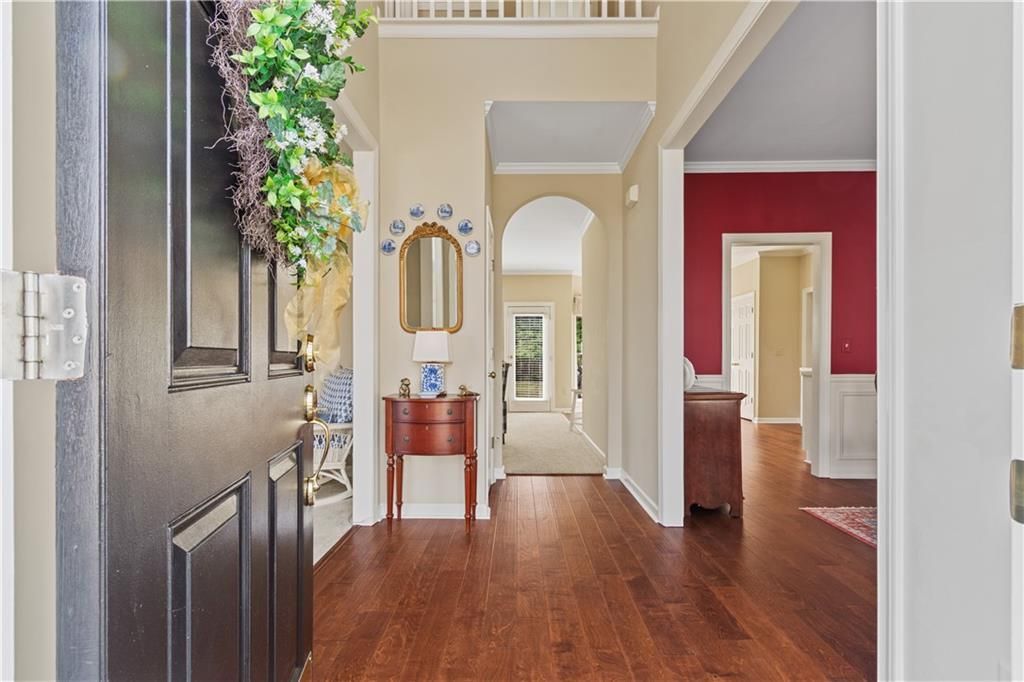 Welcome to this lovingly maintained and move-in ready home located in the highly sought-after North Forsyth school district within the charming Haddon Hall community. Offering 5 bedrooms and 3 bathrooms, this spacious home provides both comfort and flexibility for modern living. The additional rooms can easily serve as home offices or guest rooms, making the layout ideal for today's work-from-home lifestyle. The home has been freshly painted inside and out, giving it a clean, updated feel throughout. The second floor primary suite features a large walk-in closet and spacious bathroom with a relaxing soaking tub. The bedroom/expansive finished room over the garage (FROG) offers incredible versatility (perfect as a playroom, media room, or office) and also includes an additional bonus room ideal for extra walk-in closet storage or hobby space. The main-floor bedroom and full bath offer exceptional flexibility, making the home ideal for accommodating guests, multigenerational living, or a convenient private retreat. The kitchen has been thoughtfully updated with brand-new stainless steel appliances, freshly painted cabinetry, and elegant gold hardware and fixtures that add a stylish, modern touch. Throughout the home, updated light fixtures enhance each space, while dimming lights in the foyer and kitchen create a warm, inviting ambiance.The main level offers wonderful spaces for both everyday living and entertaining, including a dining room with box bay windows, a living room, and a spacious family room for gatherings. The main level features a combination of pristine hardwood floors and carpeting. The garage includes new lighting and added storage, offering excellent functionality and organization. Situated on a wooded lot, the home enjoys exceptional shade and privacy, creating a peaceful outdoor setting. The private backyard is perfect for hosting barbecues and family gatherings. The property's HVAC units have been meticulously maintained, working in harmony with the surrounding trees to help keep the home cool during hot Georgia summers. The roof has been inspected regularly and is in excellent condition. Haddon Hall offers a warm, welcoming neighborhood atmosphere, and the home's convenient location provides easy access to GA-400, making commuting to Atlanta and surrounding metro areas simple and convenient. This beautifully maintained home blends space, thoughtful updates, and a serene natural setting, a wonderful opportunity in one of North Forsyth's most desirable areas.