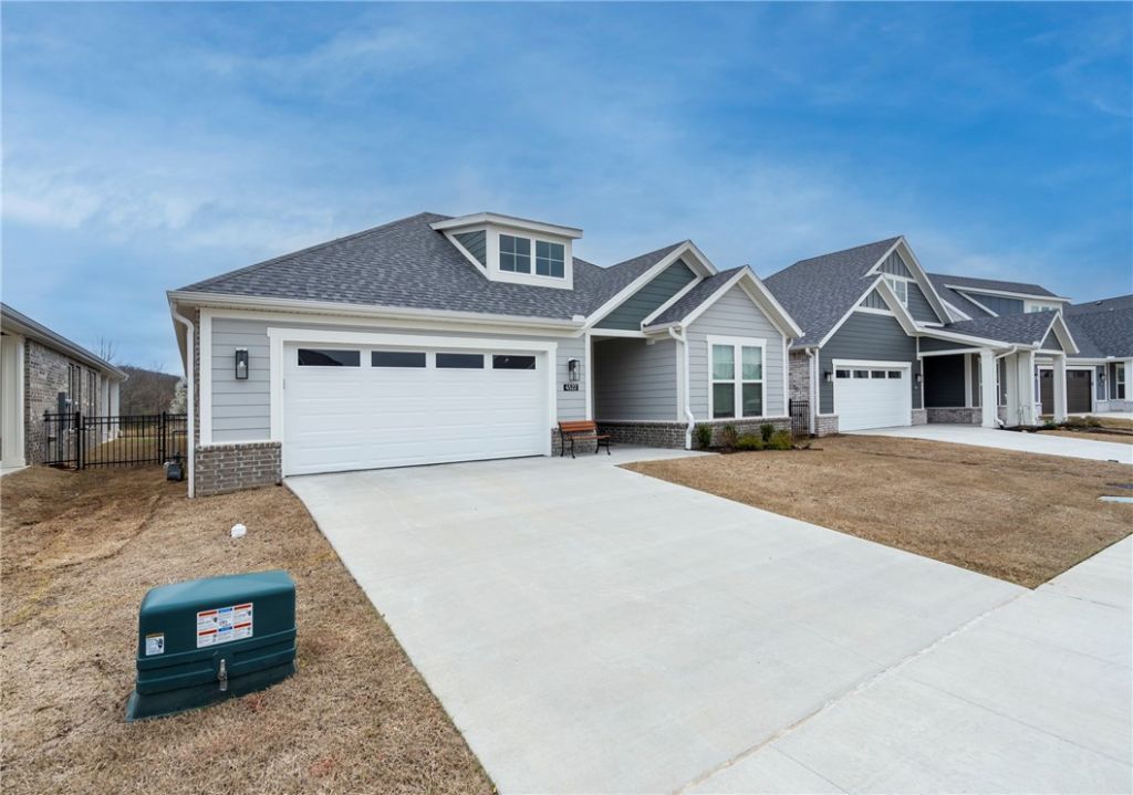 Enjoy relaxed, low-maintenance living in the sought-after The Courtyards at Owl Creek, a 55+ active adult community in West Fayetteville. This nearly new home features a bright open-concept design with 2 bedrooms plus a versatile flex room?perfect for a home office, study, or den. The inviting living area is centered around a gas log fireplace with custom built-in shelving, creating a warm and welcoming space to gather. Step outside to your private courtyard retreat with an upgraded covered patio overlooking Owl Creek and peaceful greenspace, accessible from both the living room and the spacious primary suite. The primary bath offers double vanities and a walk-in shower for everyday comfort. Enjoy true lock-and-leave convenience with HOA-covered lawn care, sprinkler maintenance, and snow removal. Future neighborhood amenities include a clubhouse and pickleball courts. Ideally located near trails, parks, shopping, dining, and quick access to I-49.