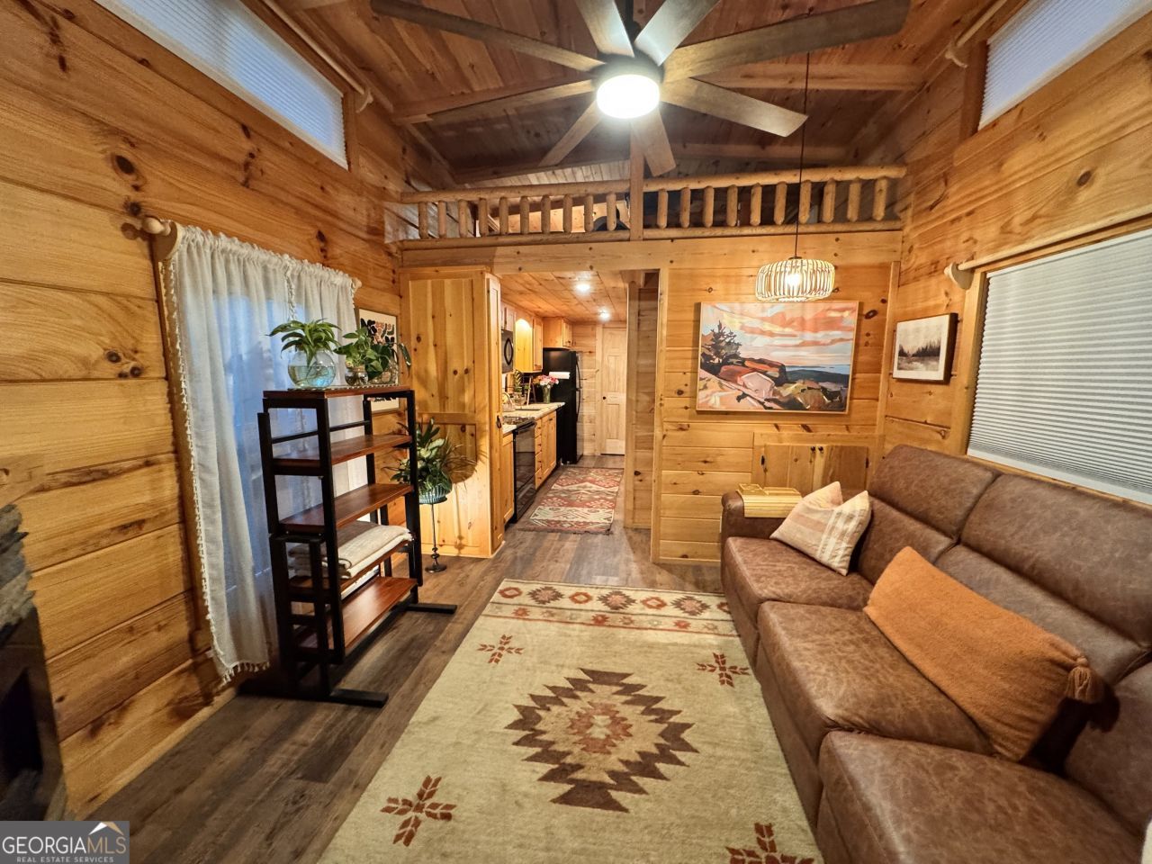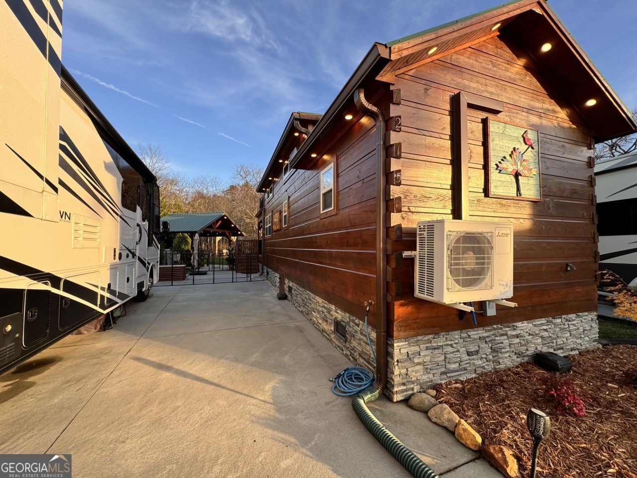 Welcome to this charming creekfront tiny log cabin in the sought-after Crossing Creek RV Resort & Tiny Home Community. Perfectly positioned along the water, this unique mountain retreat offers peaceful views, thoughtful outdoor spaces, and the perfect balance of privacy and community living. Inside, the home features a king bedroom, full kitchen, full bathroom, and loft, maximizing space while maintaining the cozy character of a true mountain cabin. Large windows invite in abundant natural light and create a bright, airy connection to the outdoors. Step outside and enjoy one of the property's most special features, a private-feeling backyard along the creek, where mature evergreens provide a natural buffer. Relax on the swing overlooking the water, gather around the stone firepit, or head up to the sky deck, an elevated observation deck perfect for stargazing. Cabin recently re-stained and added gutters. Soffit lighting adds a warm glow or colors to celebrate holiday's! In addition to the cabin, the spacious lot is designed to accommodate even the largest motorhomes or fifth wheels, making it ideal for RV owners or guests traveling with larger rigs. Located within Crossing Creek RV Resort, owners enjoy access to a beautifully maintained community with scenic walking paths, gathering spaces, and a welcoming mountain atmosphere. Whether you're looking for a mountain getaway, full-time tiny home living, or an investment opportunity, this creekfront property offers a rare combination of charm, flexibility, and outdoor living in the North Georgia mountains.