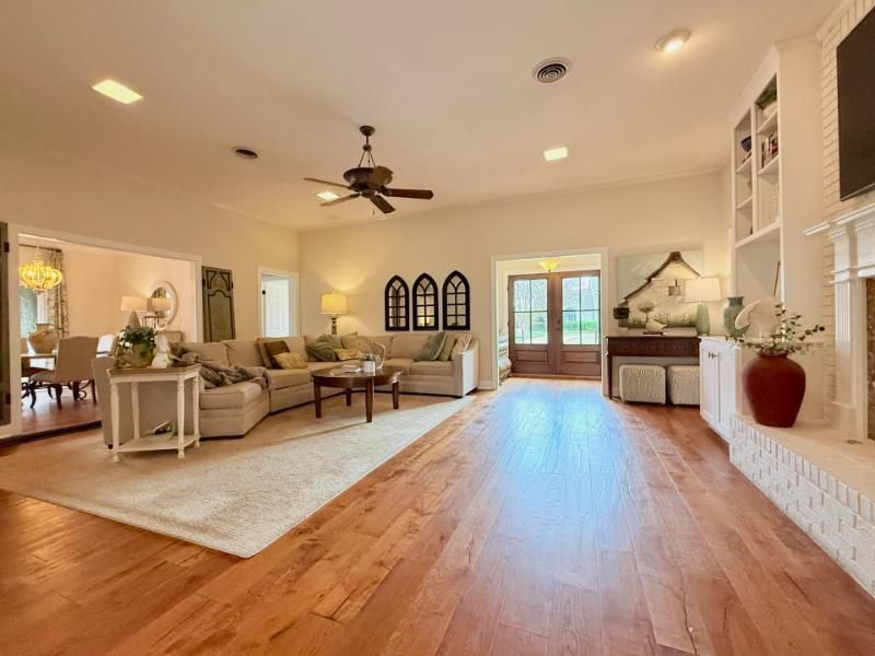 Beautifully updated 4BR/3BA home in desirable Oak Meadows! This one level home has a fantastic floor plan that includes a spacious family room with vaulted ceiling, formal dining, beautiful kitchen with quartz countertops, custom cabinetry, keeping room with built ins and breakfast area that connects to a cozy second living space with fireplace and office.The large primary suite offers a private bath with dual vanities, soaking tub, and separate shower and connects to a cozy sitting room with french doors overlooking the back patio. An additional three bedrooms as well as two recently updated full baths.Additional highlights include a large laundry room with brick floors and a patio that is perfect for outdoor entertaining.The home also features two garages, offering ample